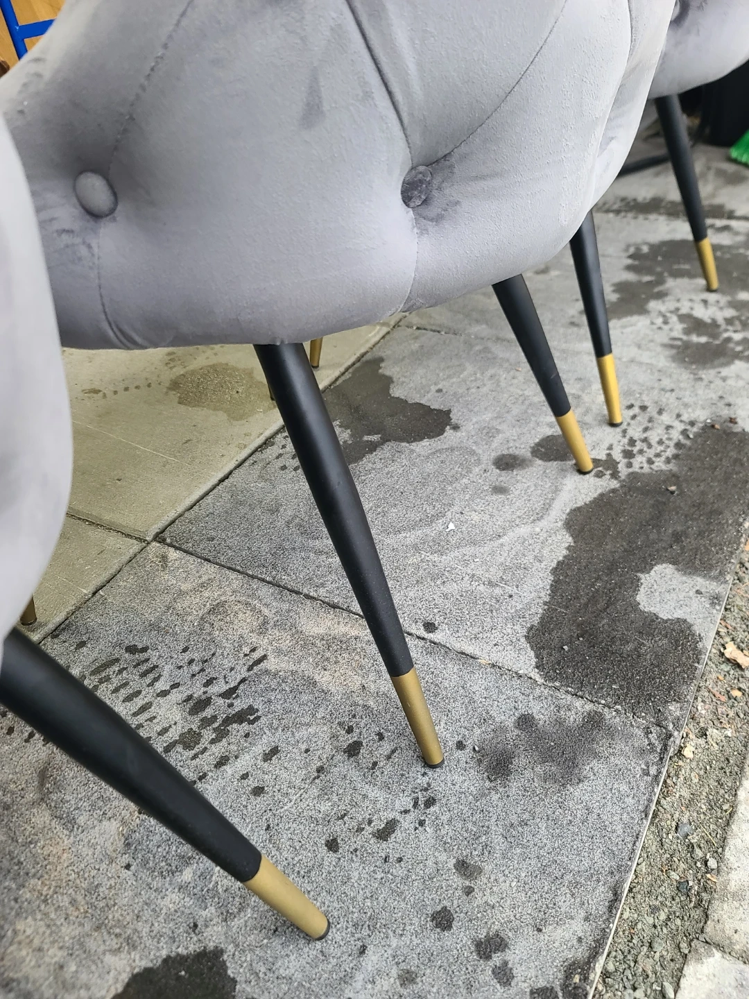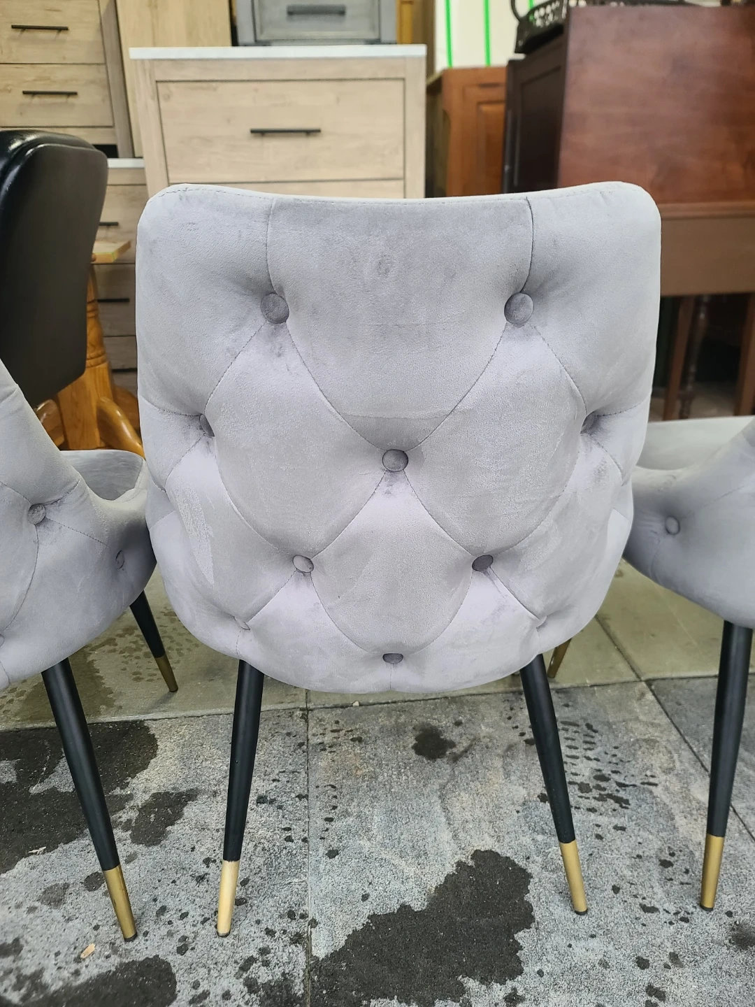 Four stylish dining chairs upholstered in soft grey velvet. They feature a tufted back and sleek black legs with decorative gold tips. These chairs would be a great addition to any dining room or kitchen space! Measurements: W 20" X D 19" X H 34". Delivery can be arranged. Viewing and pickup by appointment.
