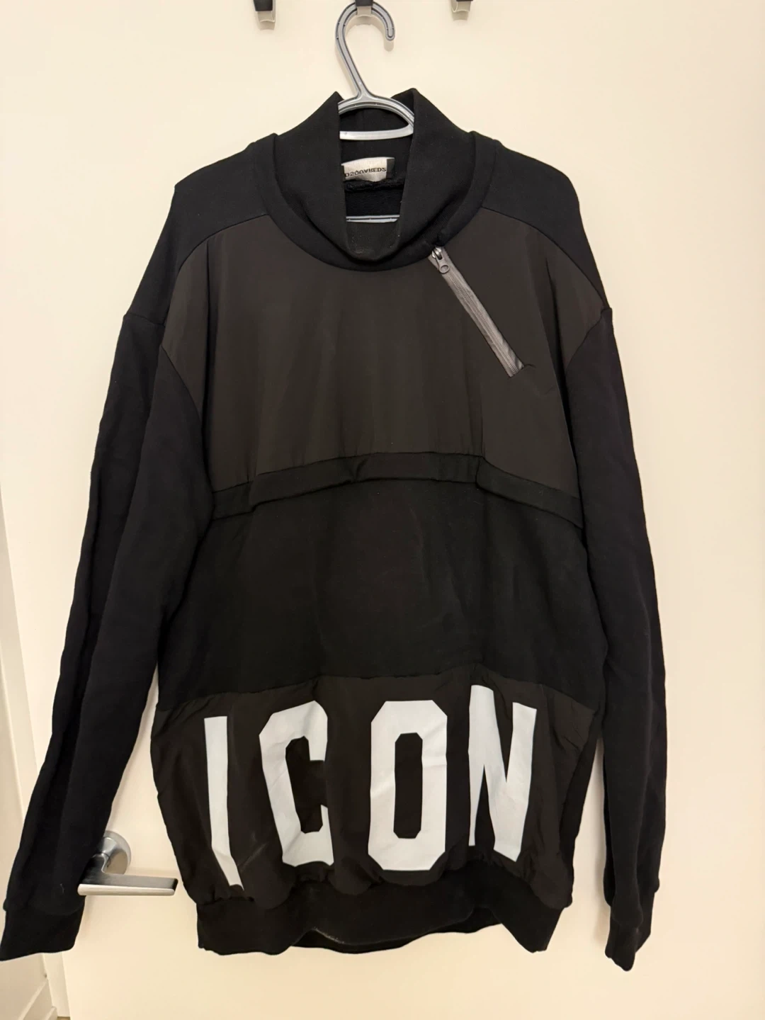 Black streetwear sweatshirt with bold ICON graphic and zip.