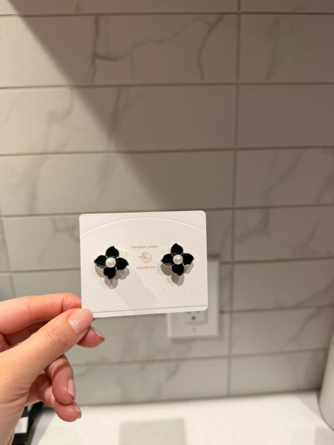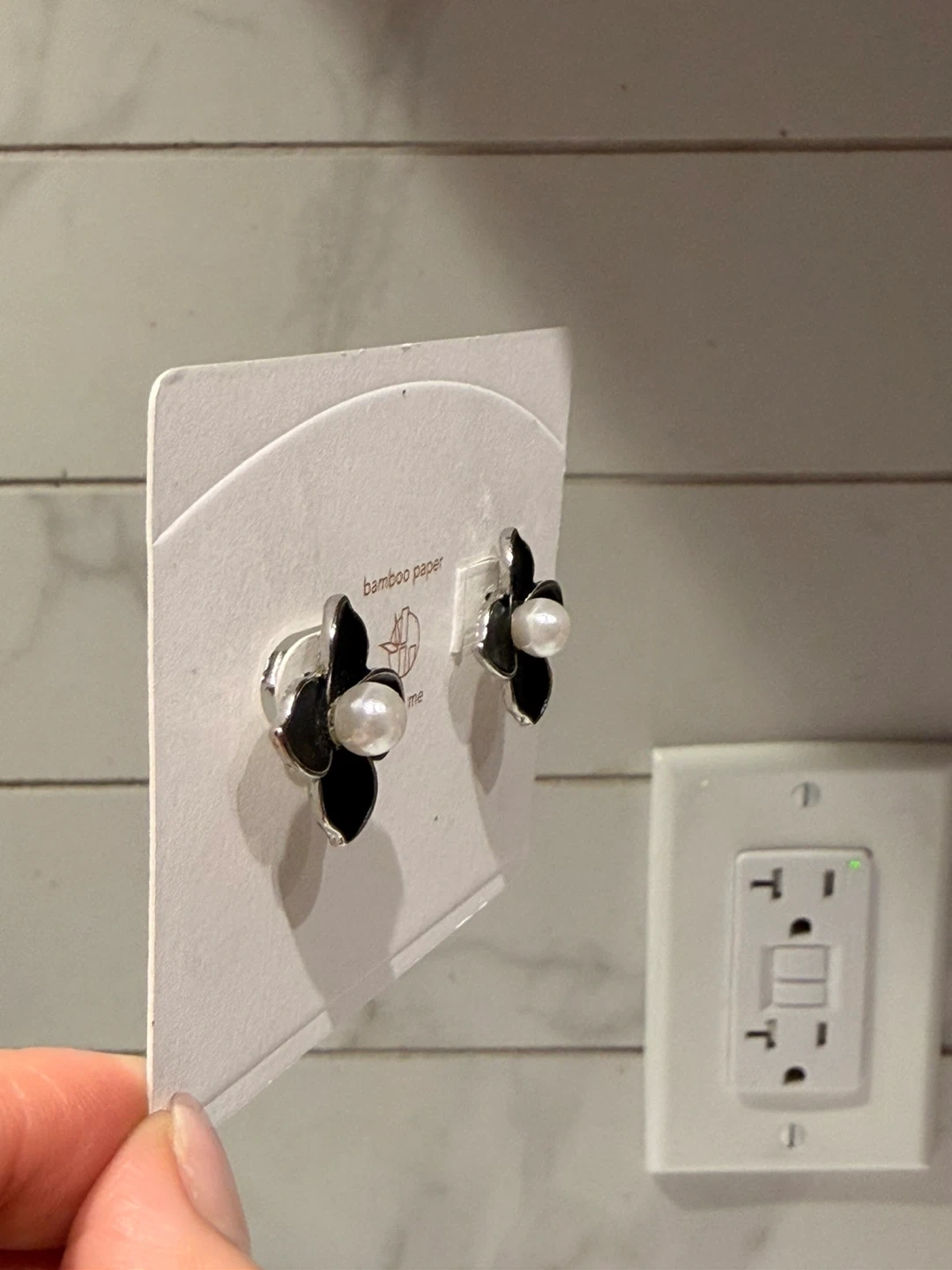 Cute black floral stud earrings with a faux pearl in the centre. These earrings are perfect for adding a subtle touch of elegance to any outfit, whether for everyday wear or a special occasion.