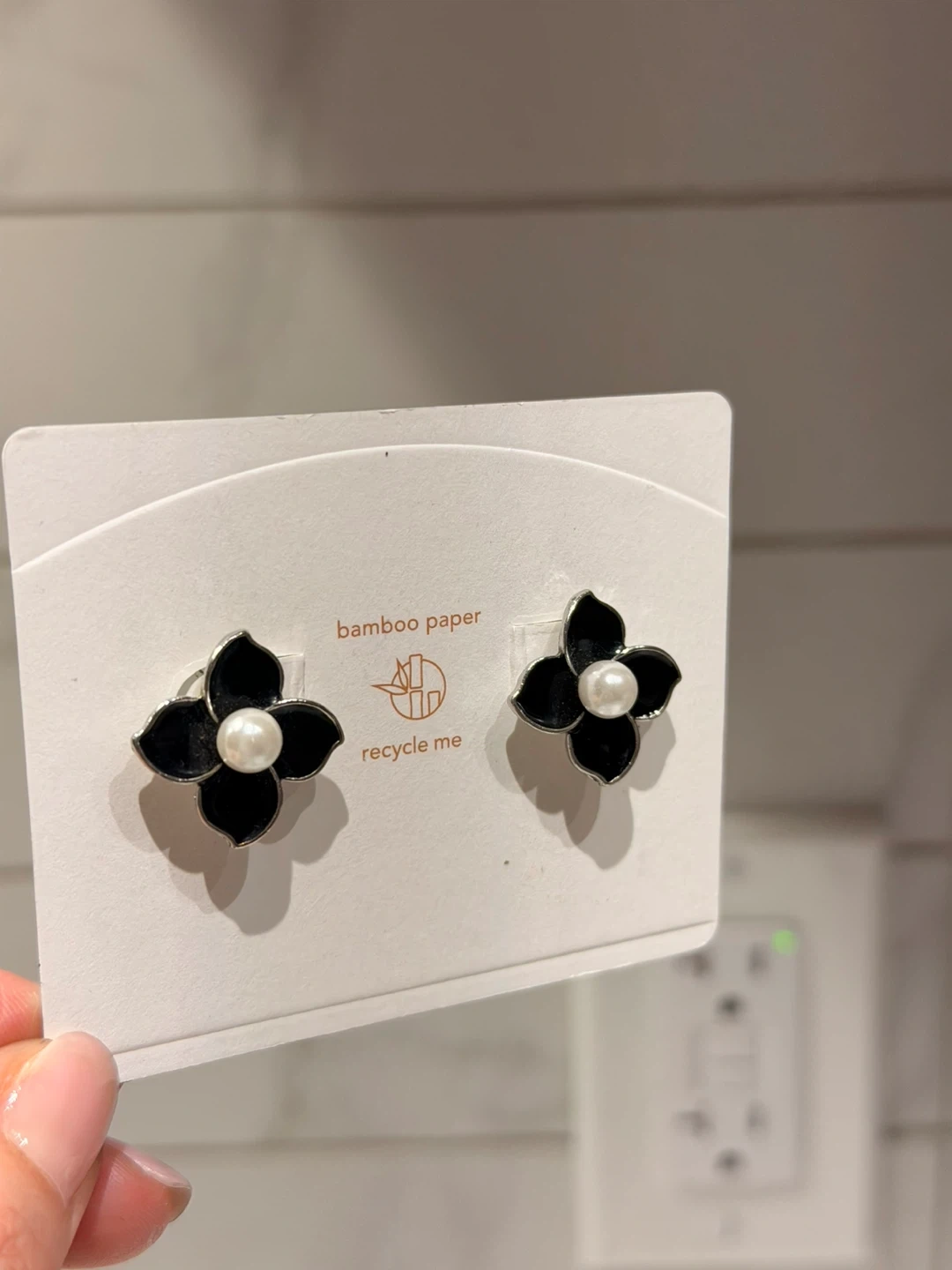 Cute black floral stud earrings with a faux pearl in the centre. These earrings are perfect for adding a subtle touch of elegance to any outfit, whether for everyday wear or a special occasion.