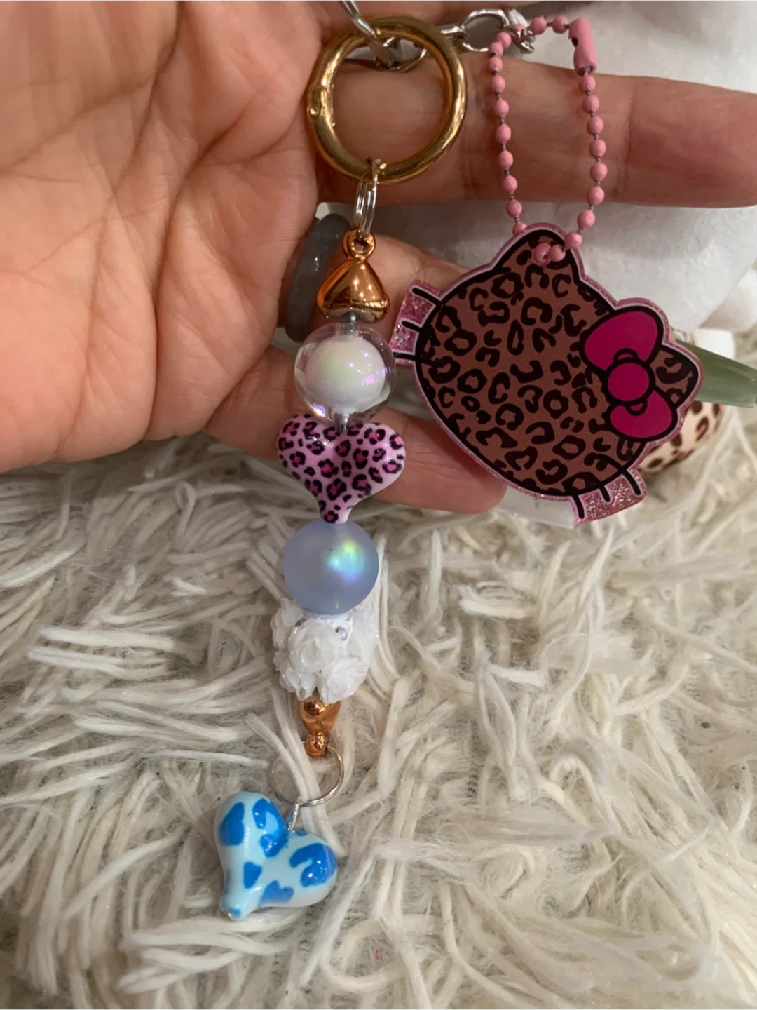 Super cute Hello Kitty keychain with a leopard print theme! It features a plush Hello Kitty and a matching charm. Perfect for adding a touch of kawaii to your keys or bag
