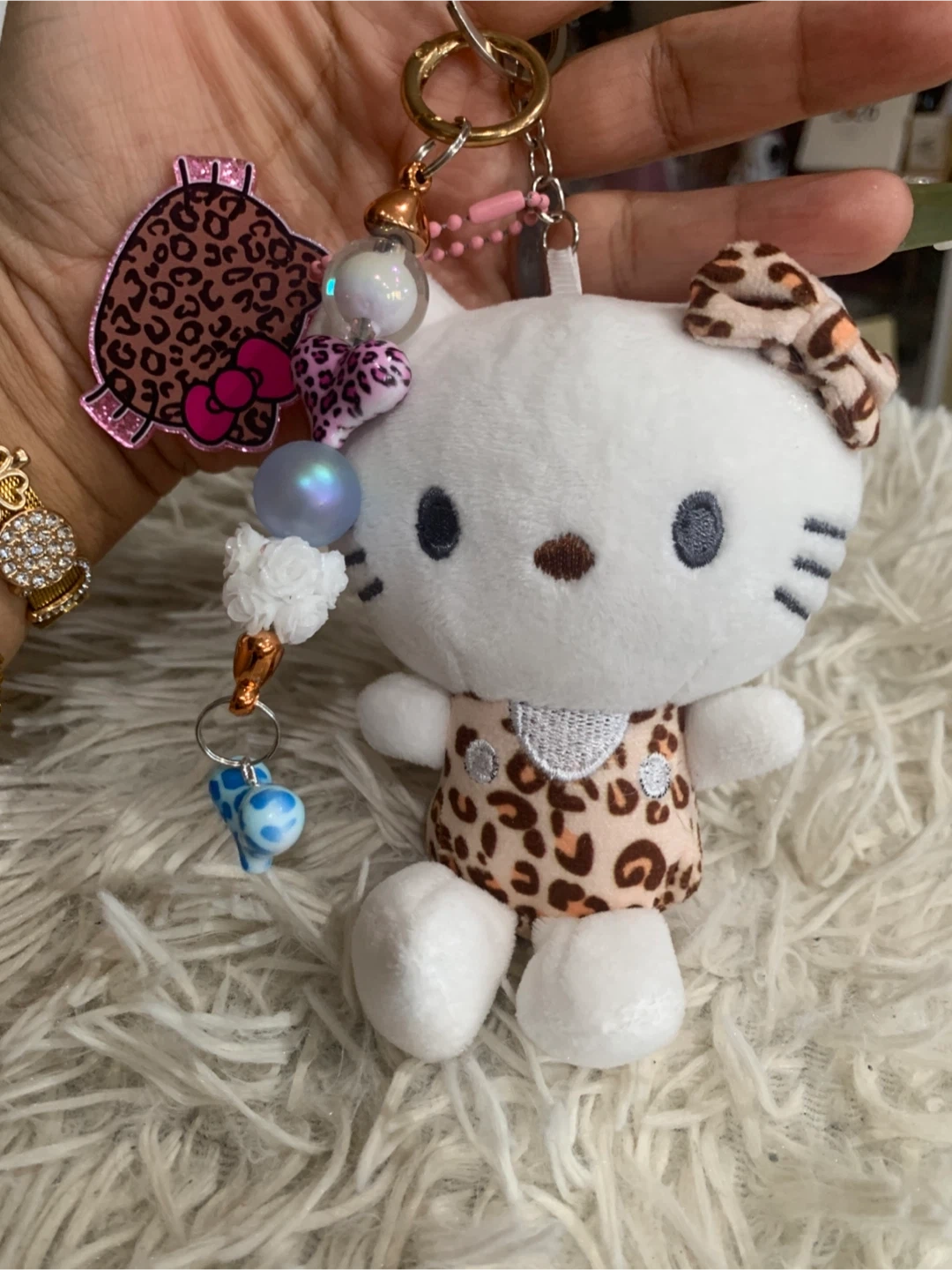 Super cute Hello Kitty keychain with a leopard print theme! It features a plush Hello Kitty and a matching charm. Perfect for adding a touch of kawaii to your keys or bag