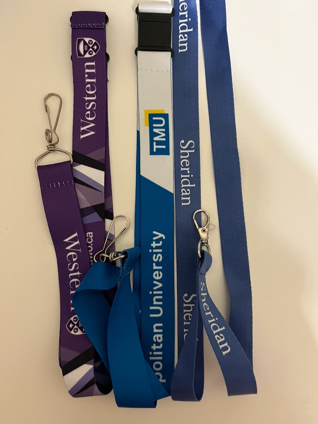 Three lanyards. One purple with Western University branding, one blue with TMU branding, and one blue with Sheridan College branding. Also have a yellow lakehead and Guelph (not shown)
