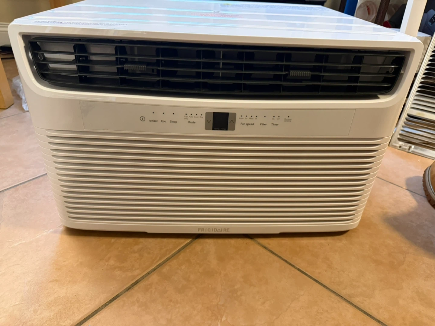 This is a Frigidaire window air conditioner. It features multiple modes including Ionizer, Eco, Sleep, and Timer. The fan speed is adjustable. This unit is great for cooling a room.