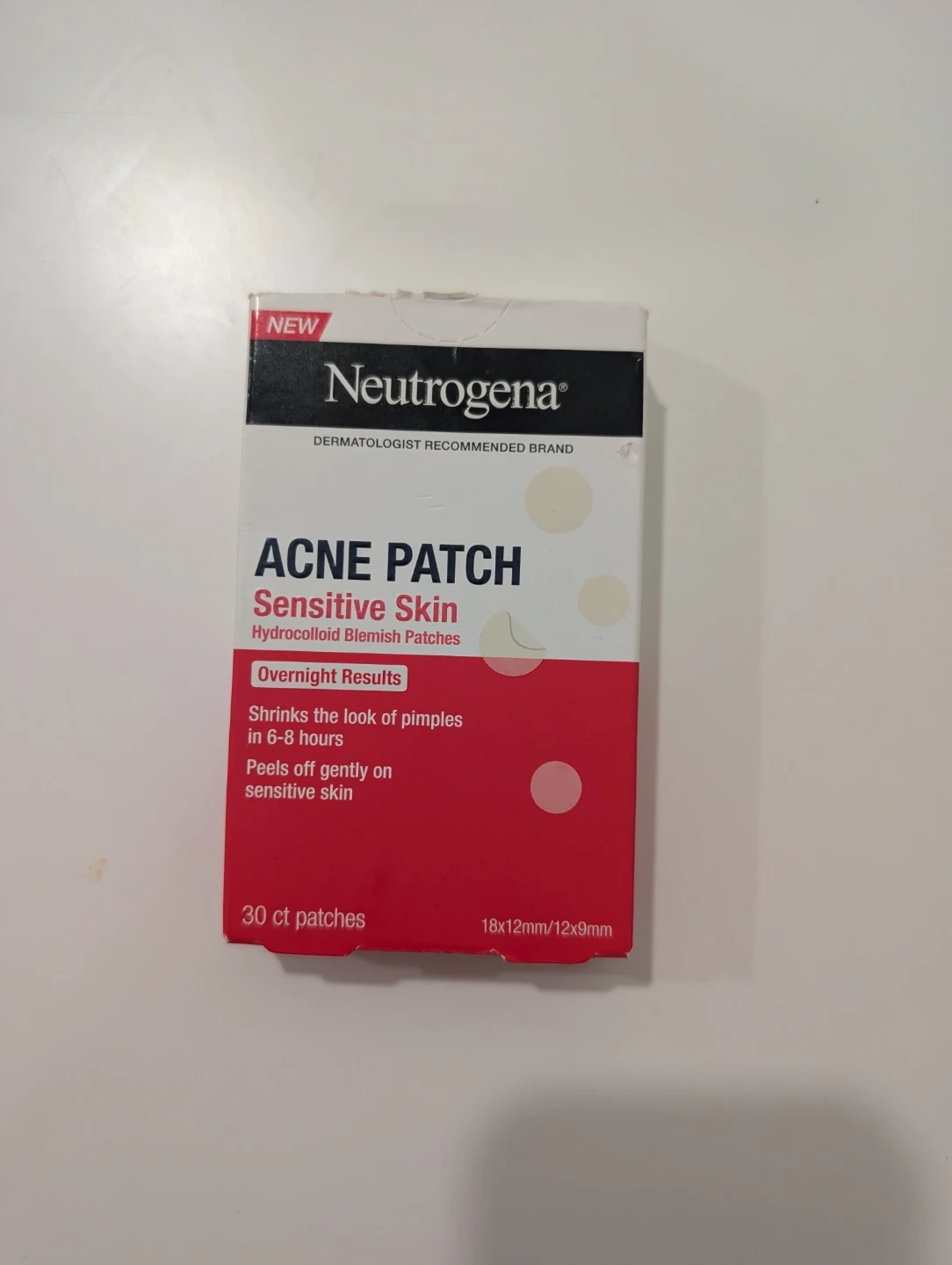 I'm selling a brand new box of Neutrogena Acne Patches for sensitive skin! These patches are designed to shrink the look of pimples in 6-8 hours and peel off gently. Each box contains 30 patches sized at 18x12mm/12x9mm