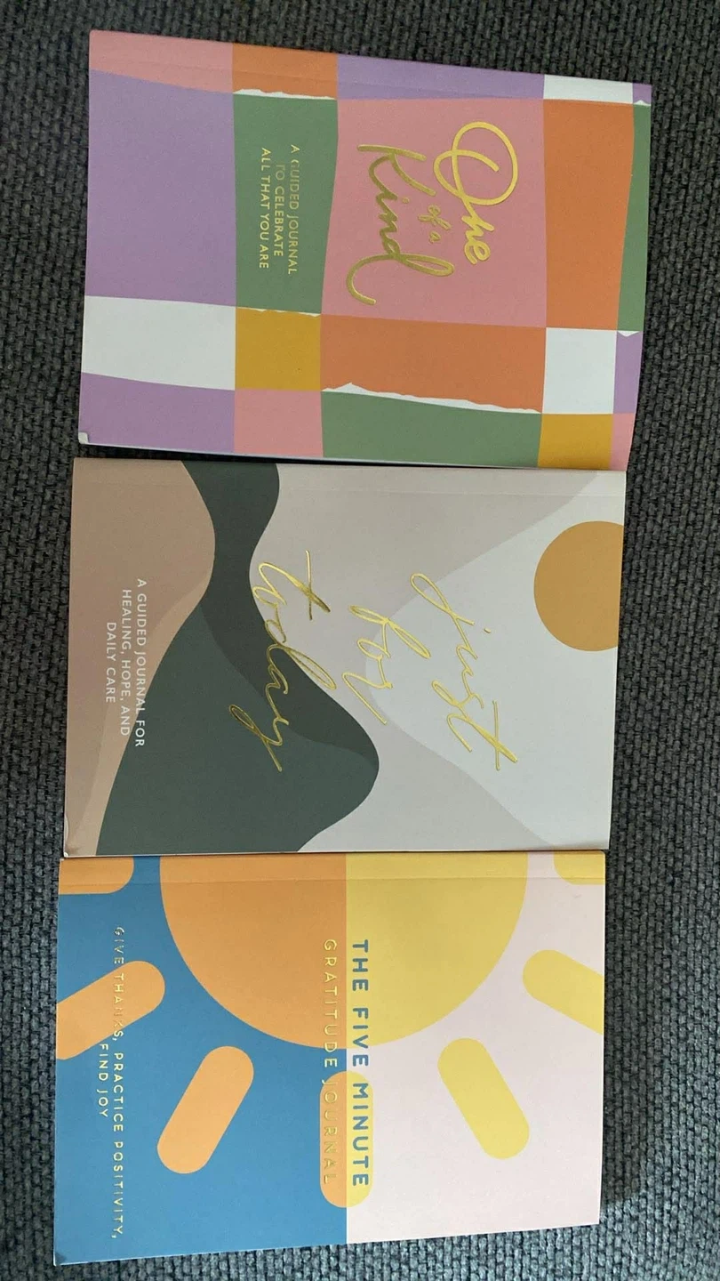 This set includes three guided journals: 'One of a Kind' to celebrate you, 'Just for Today' for healing and daily care, and 'The Five Minute Gratitude Journal' for giving thanks and finding joy. Practice positivity and boost your mood with these journals. Perfect for daily reflection and self-care!