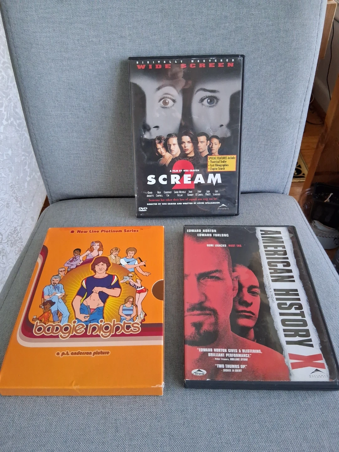 Three DVDs including Scream 2, American History X, and Boogie Nights. Scream 2 is digitally mastered widescreen. American History X is Generation X-Treme. Boogie Nights is part of the New Line Platinum.