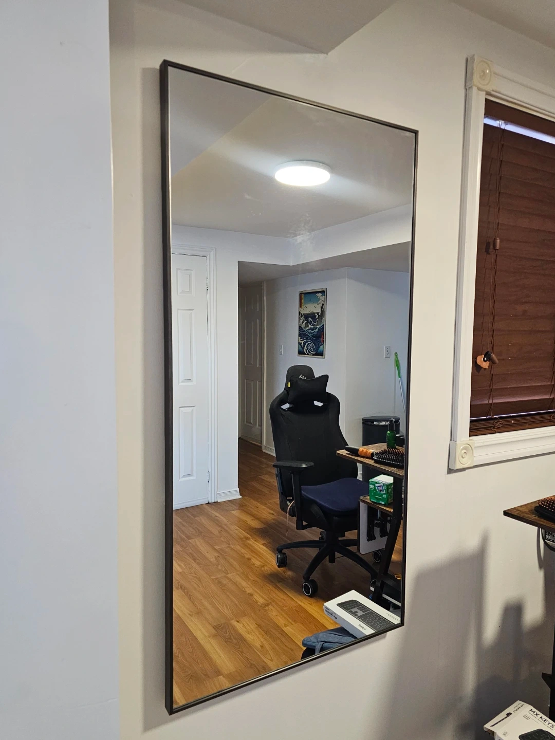This is a large rectangular mirror perfect for any room. It features a slim, dark-coloured frame for a modern look. Its reflective surface helps to brighten and open up your space.