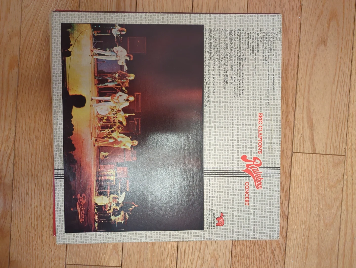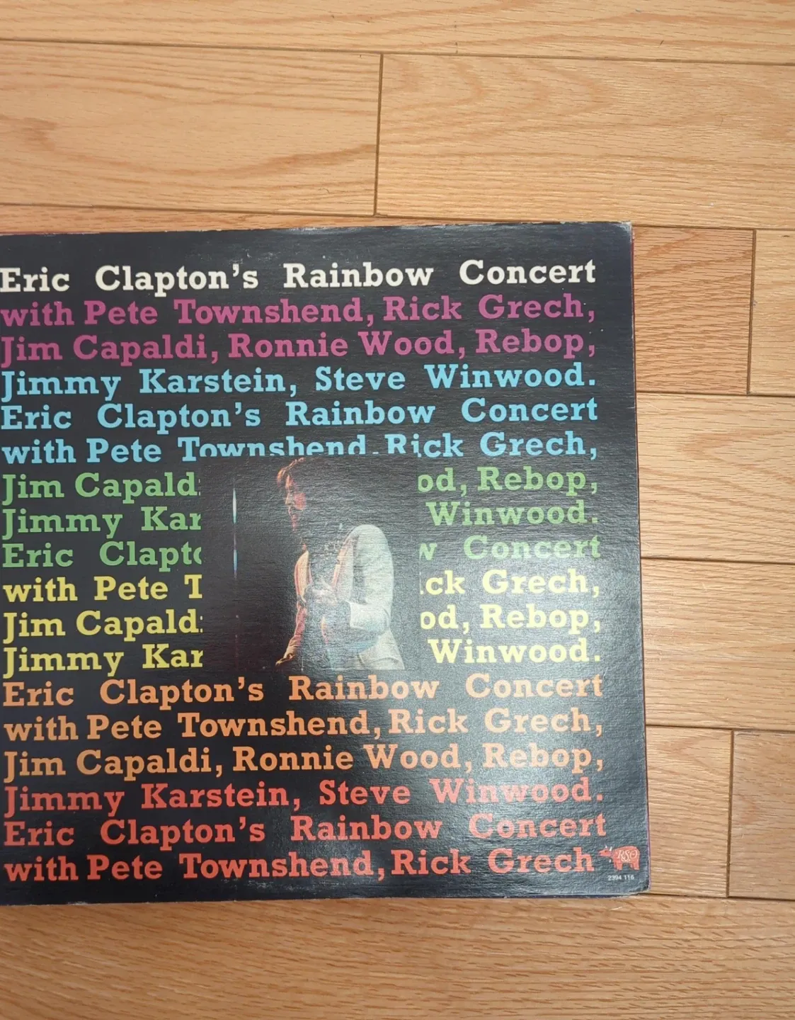 This is Eric Clapton's Rainbow Concert vinyl record. It features performances with Pete Townshend, Rick Grech, Jim Capaldi, Ronnie Wood, Rebop, and Jimmy Karsten. The record comes with supporting photos and tracklist information.