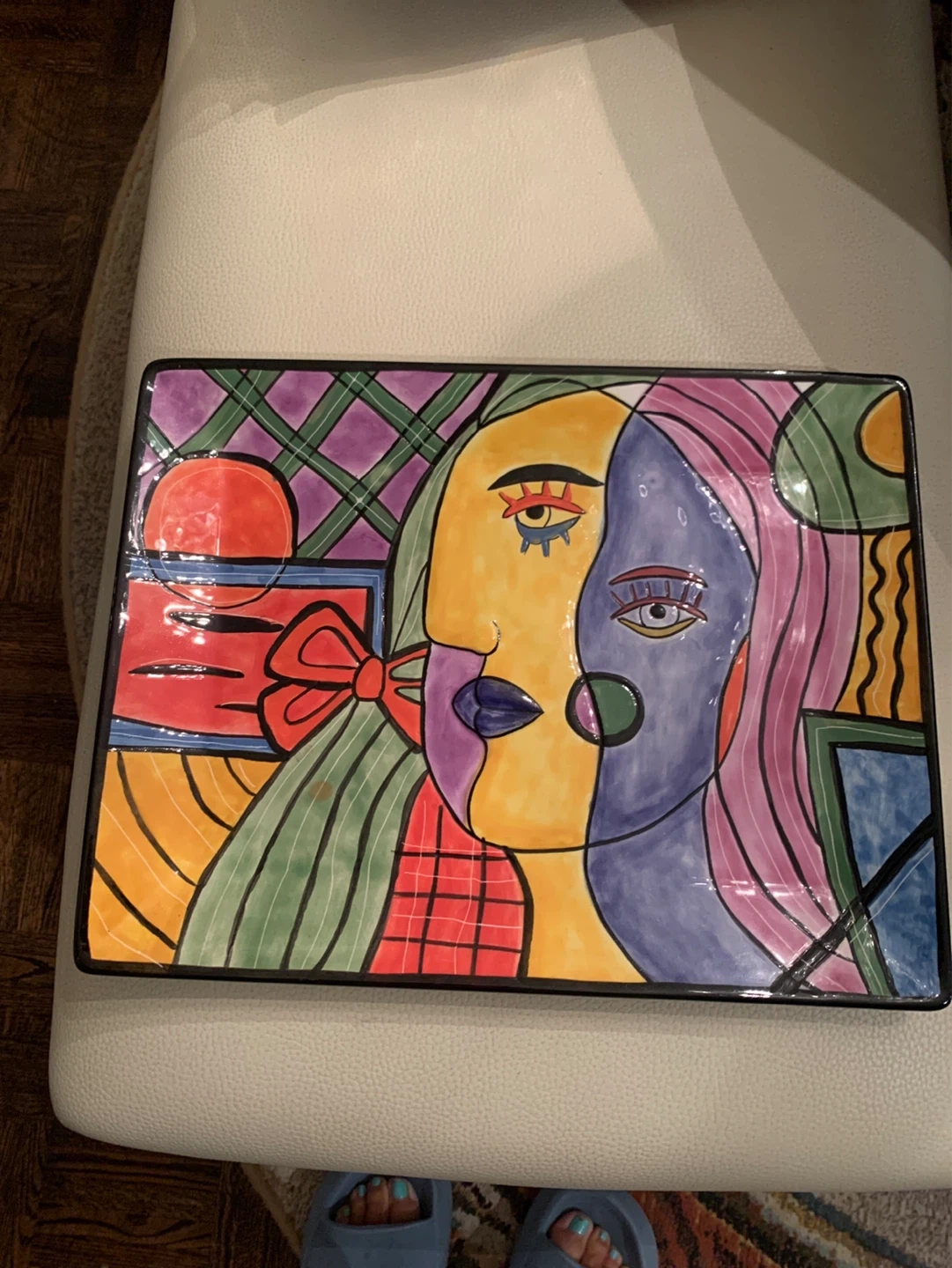 Artistic ceramic platter featuring a colourful abstract portrait design. This rectangular dish has a glossy finish and a black rim. It's suitable for serving or display. Includes a hanging hook on the back.