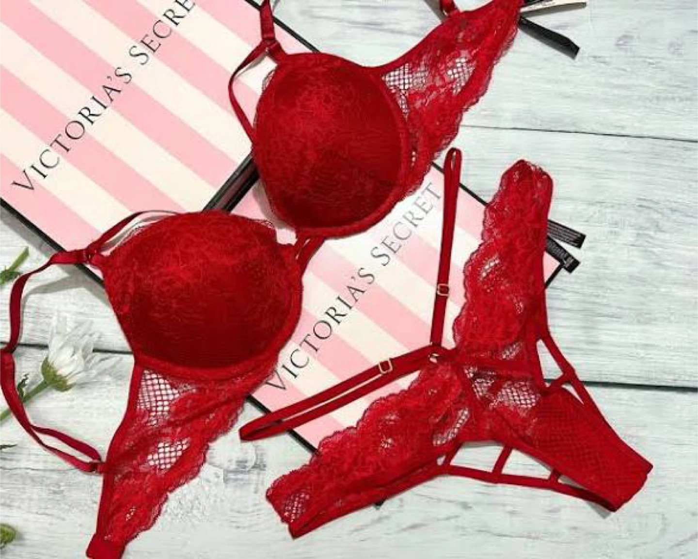 Victoria's Secret lace bra and thong set in a vibrant red. Features intricate lace detailing and adjustable straps. This set is designed for a comfortable and stylish fit.
