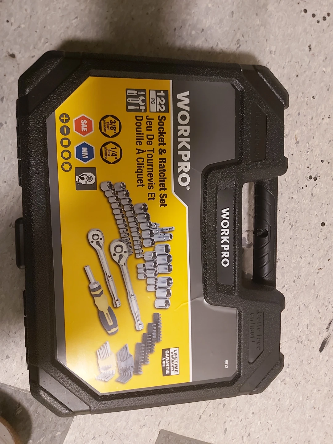 This WORKPRO 122-piece socket and ratchet set includes 3/8" and 1/4" drive tools. A ratchet and screwdriver handle are included. Everything you see in the picture is there. Brand new and even unopened. Nothing is missing.