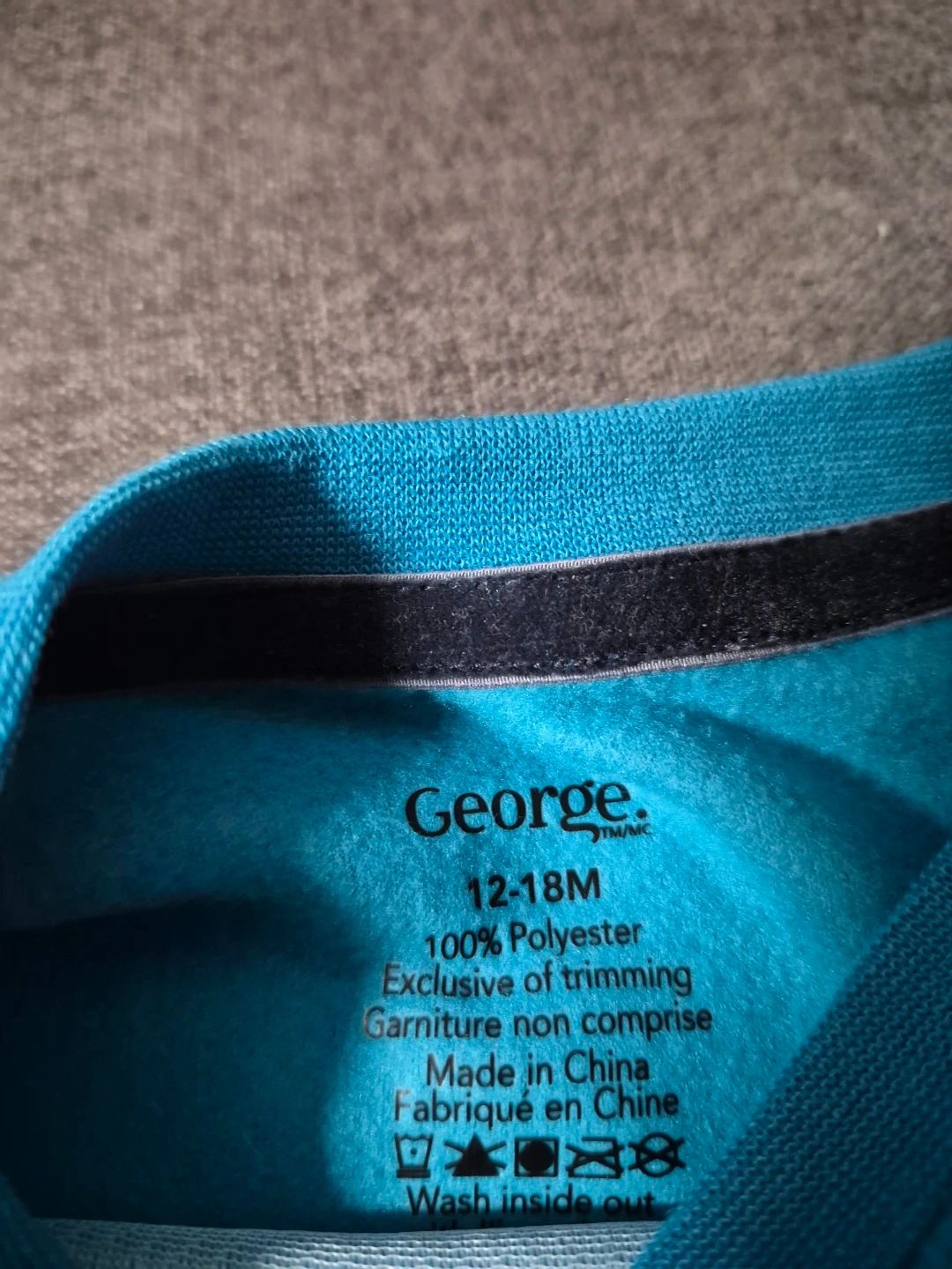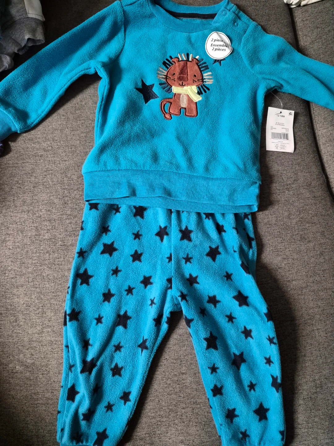 This George blue fleece set is sized 12-18 months. It's made of 100% polyester with a cute lion graphic on the top and black stars on the pants. Perfect for keeping little ones cozy at night! Tag still attached