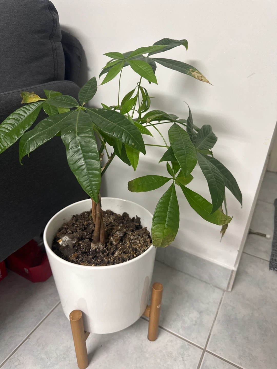 Money tree plant in a white ceramic pot with a wooden stand. It's a lovely green plant. Measures approximately 2 feet tall. Perfect for adding a touch of nature to your space!