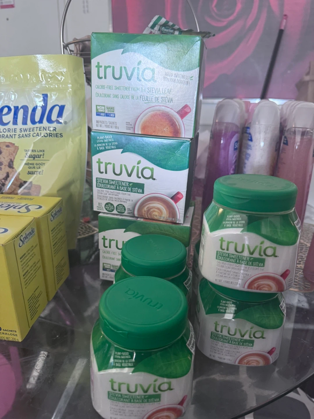 Truvia is a calorie-free sweetener made from the stevia leaf. It's plant-based and comes in packets and jars. This sweetener is a good alternative for those looking to reduce sugar intake.