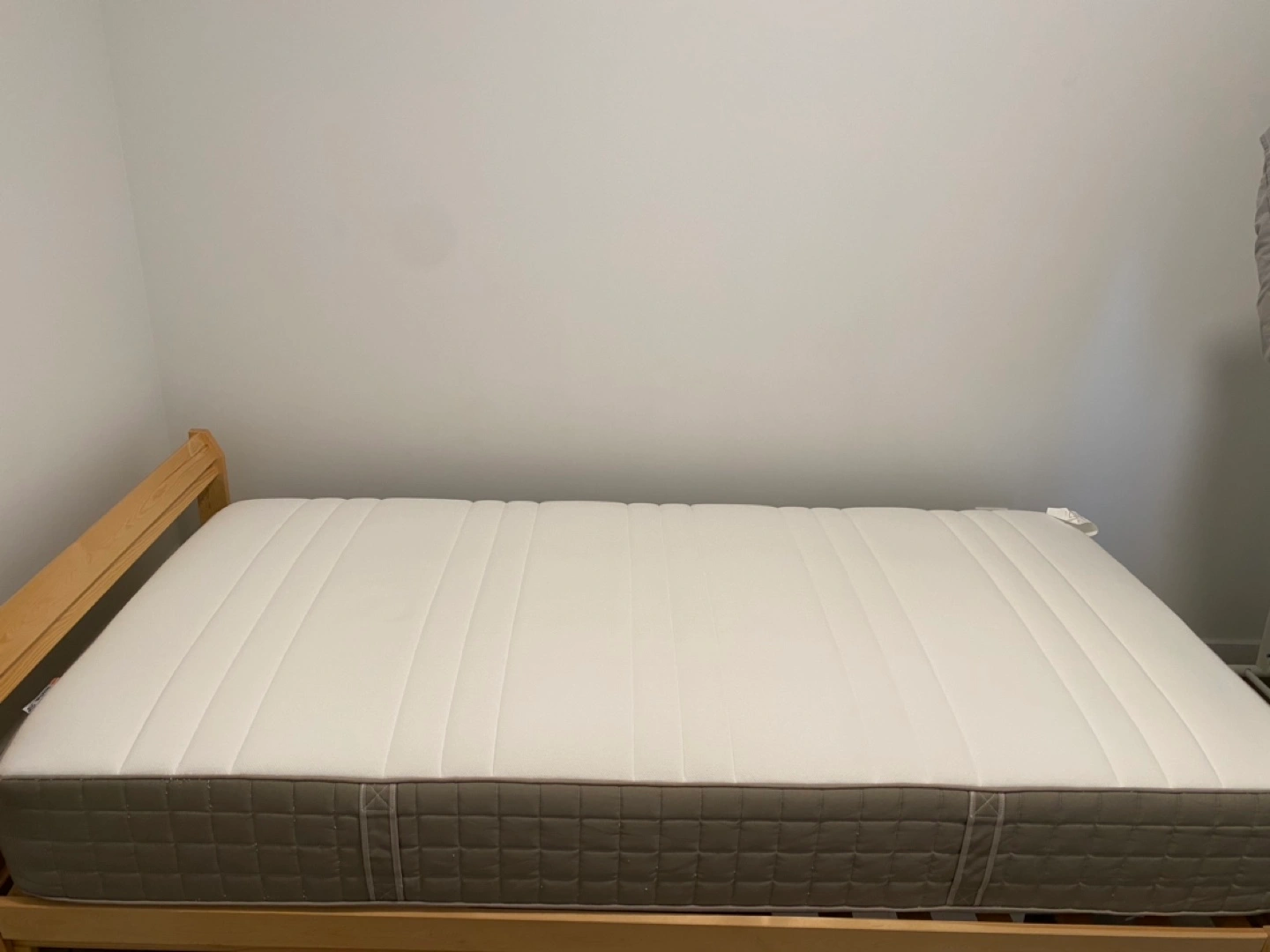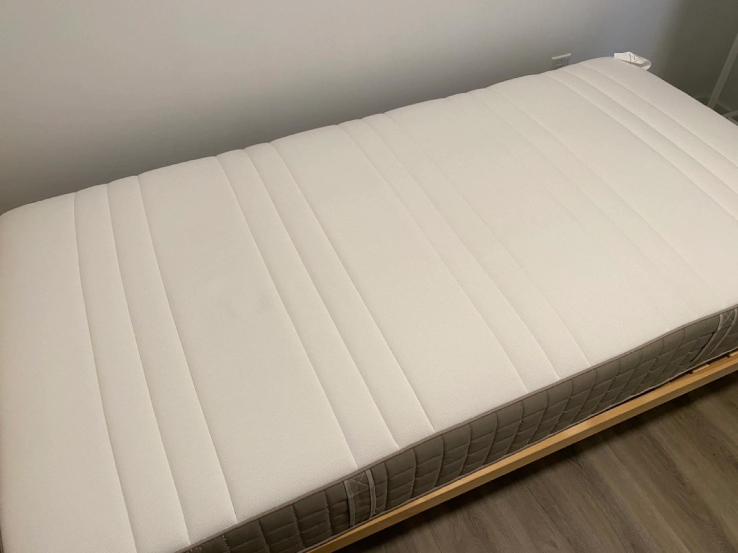 IKEA HAUGESUND hybrid mattress, twin size. Like new. Has always been in a mattress protector. It has handles on the side to make moving the mattress easier.