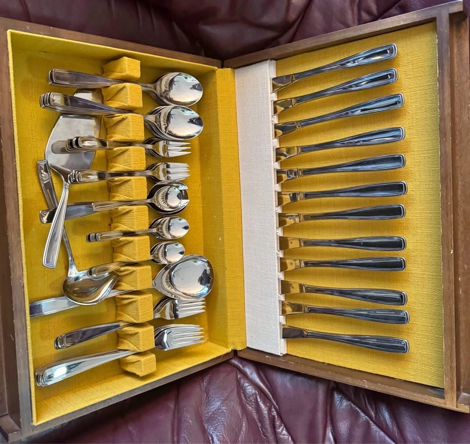 19Total 68 pieces. Wooden Storage Case Content: 12 person Cutlery set 60-piece: 12 each forks, table knives, spoons, cake forks and tea/coffee spoons. Serving Items 7 pieces. Material: Cromargan stainless steel 18/10 polished. Rust-free, dishwasher safe, dimensionally stable, sanitary, acid resistant and indestructible. Set originates from Germany.