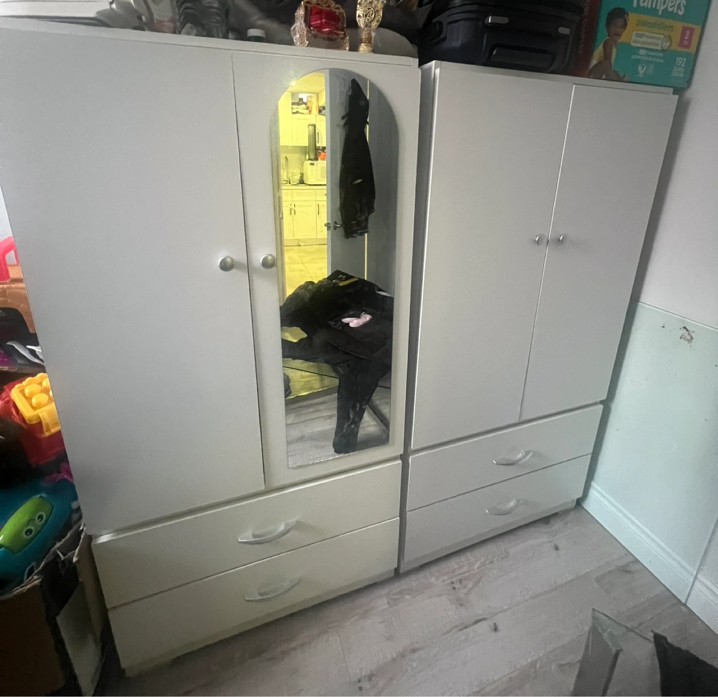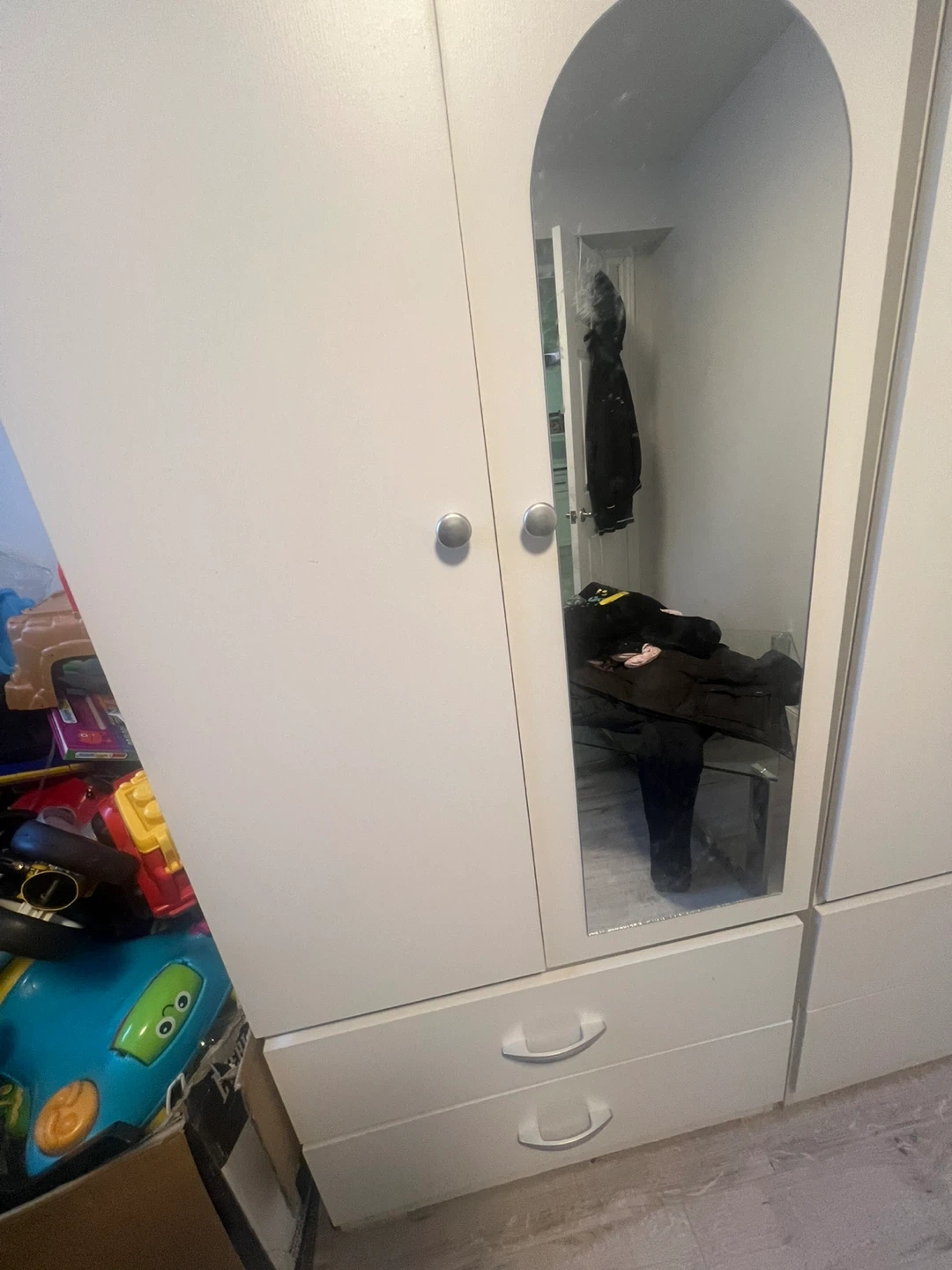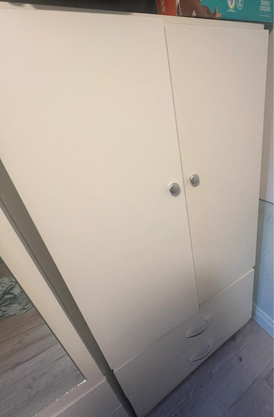 This white double door wardrobe features a full-length mirror on one door and two drawers at the bottom. It offers ample storage for your clothing and accessories. Two-door design. H.5 feet