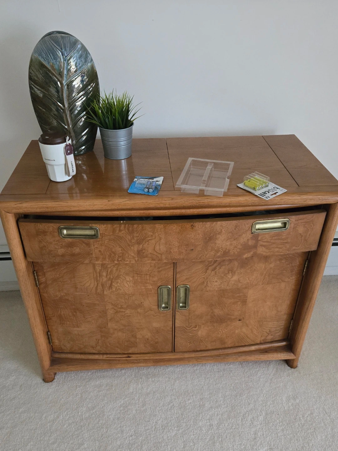 This vintage sideboard features a beautiful burl wood finish with brass hardware. It has two doors and a drawer, offering ample storage. The piece has a classic mid-century modern design.