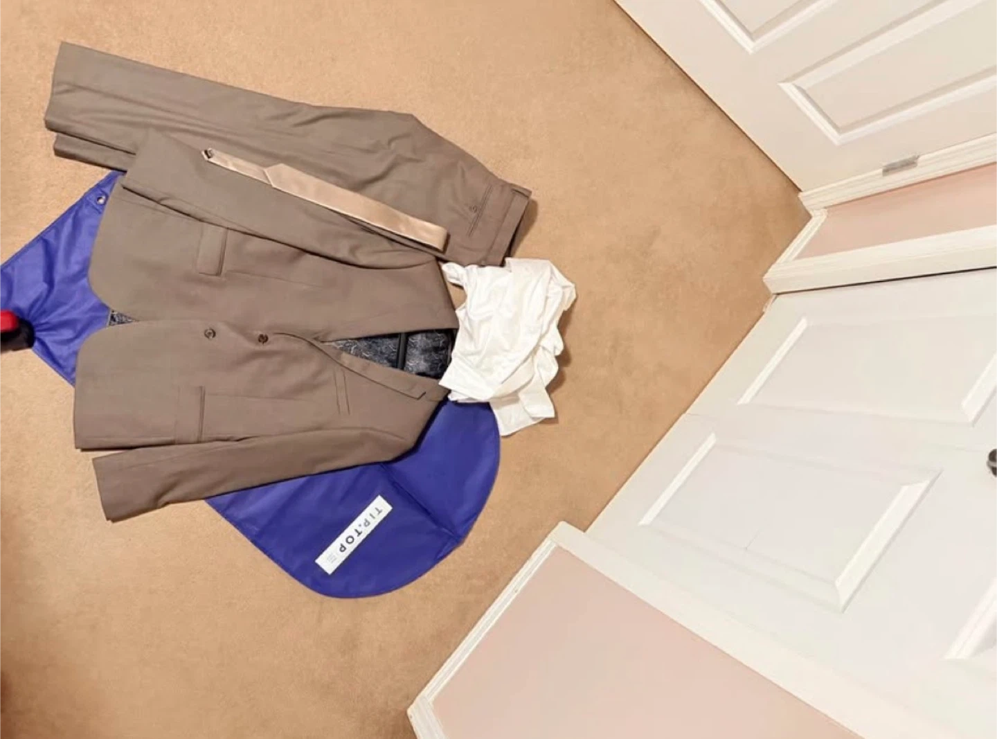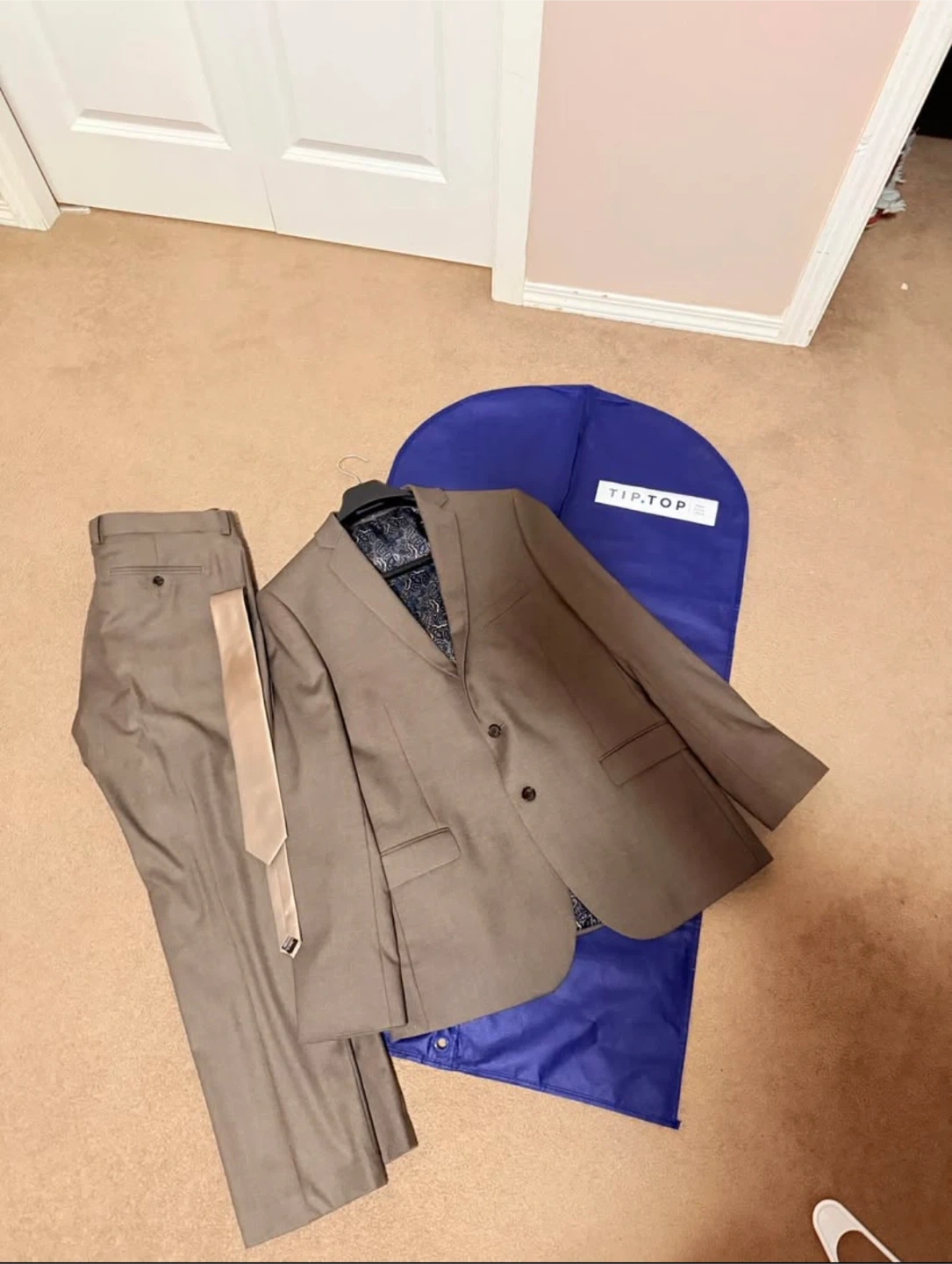 Selling a Tip Top Tailors suit in a taupe colour. It comes with the jacket, pants, and a tie. The suit is in great condition and includes a garment bag for storage