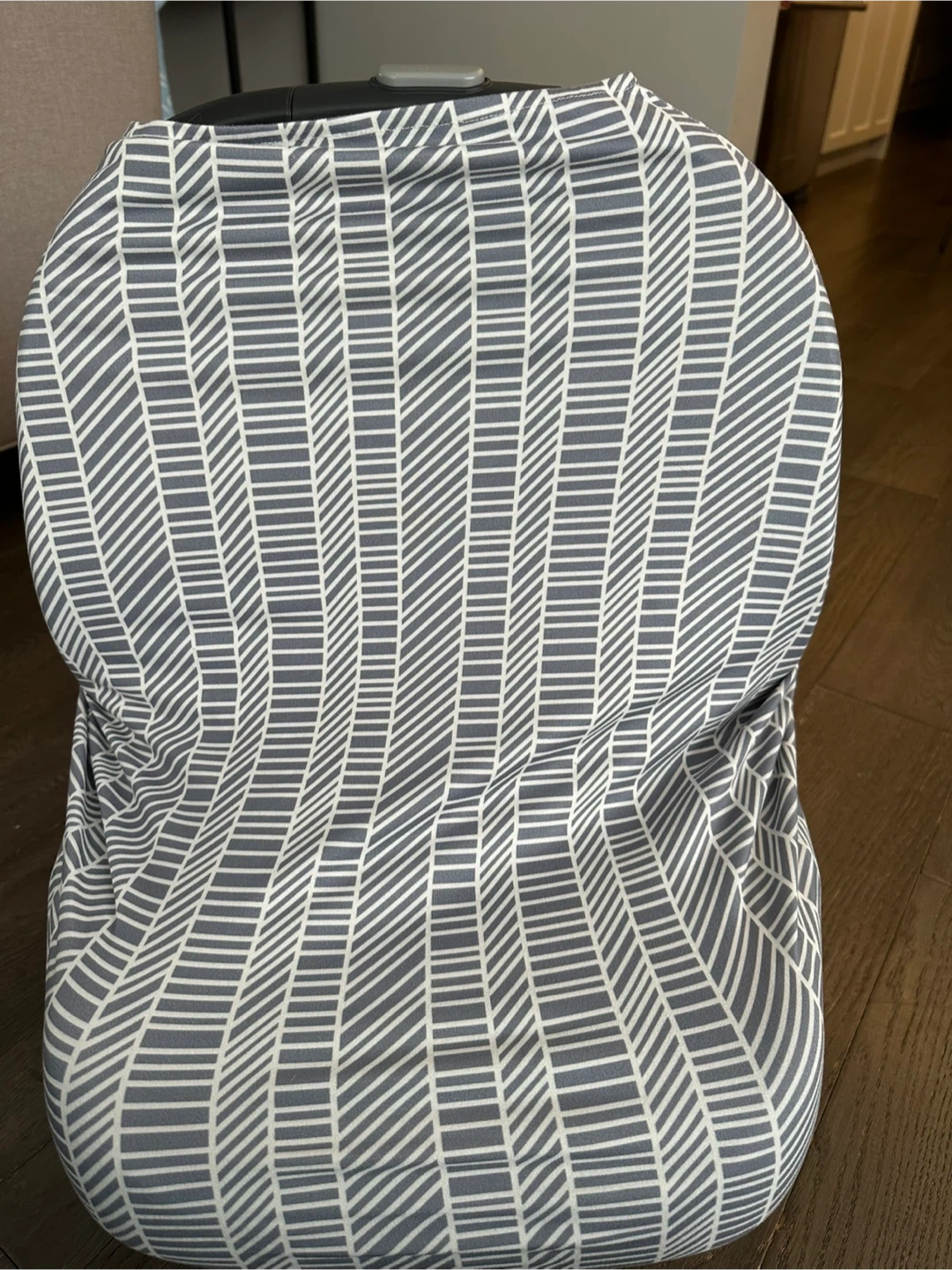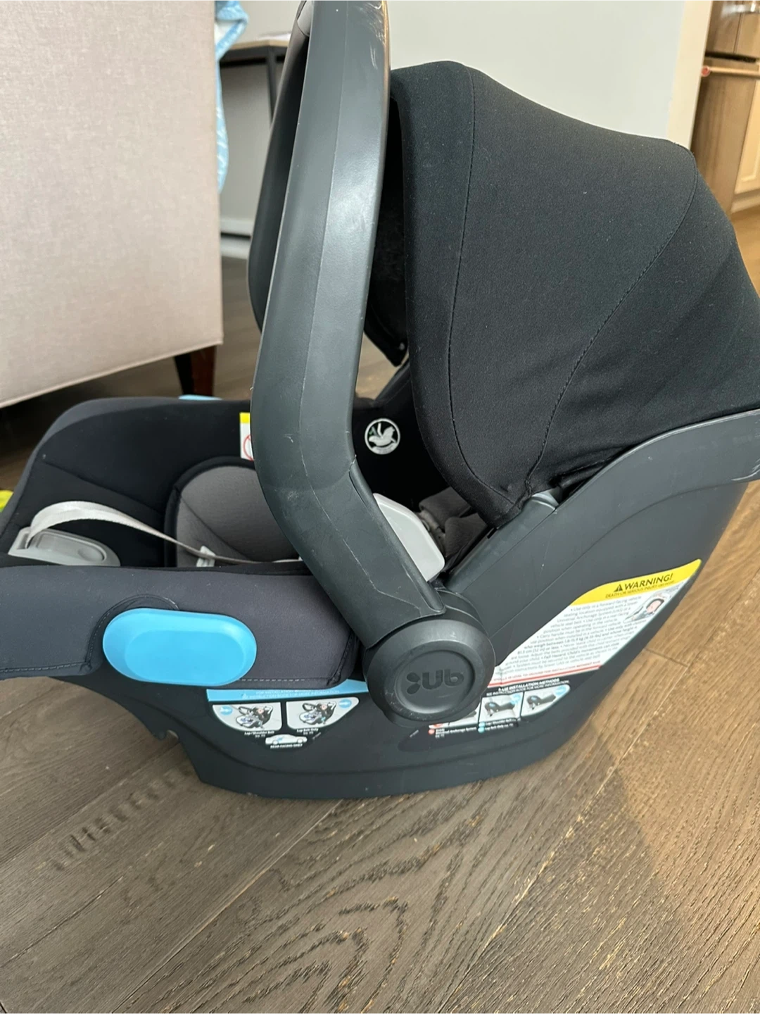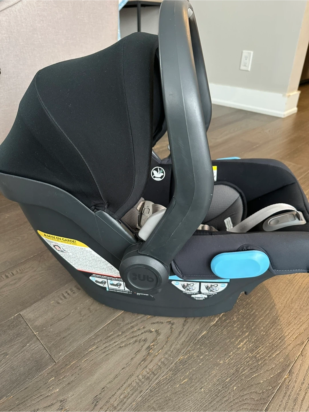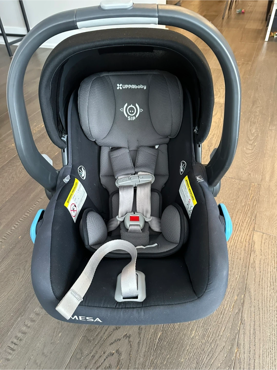 UPPAbaby MESA infant car seat in black. Manufactured in September 2021. Includes a patterned car seat cover. This car seat is designed for infants.