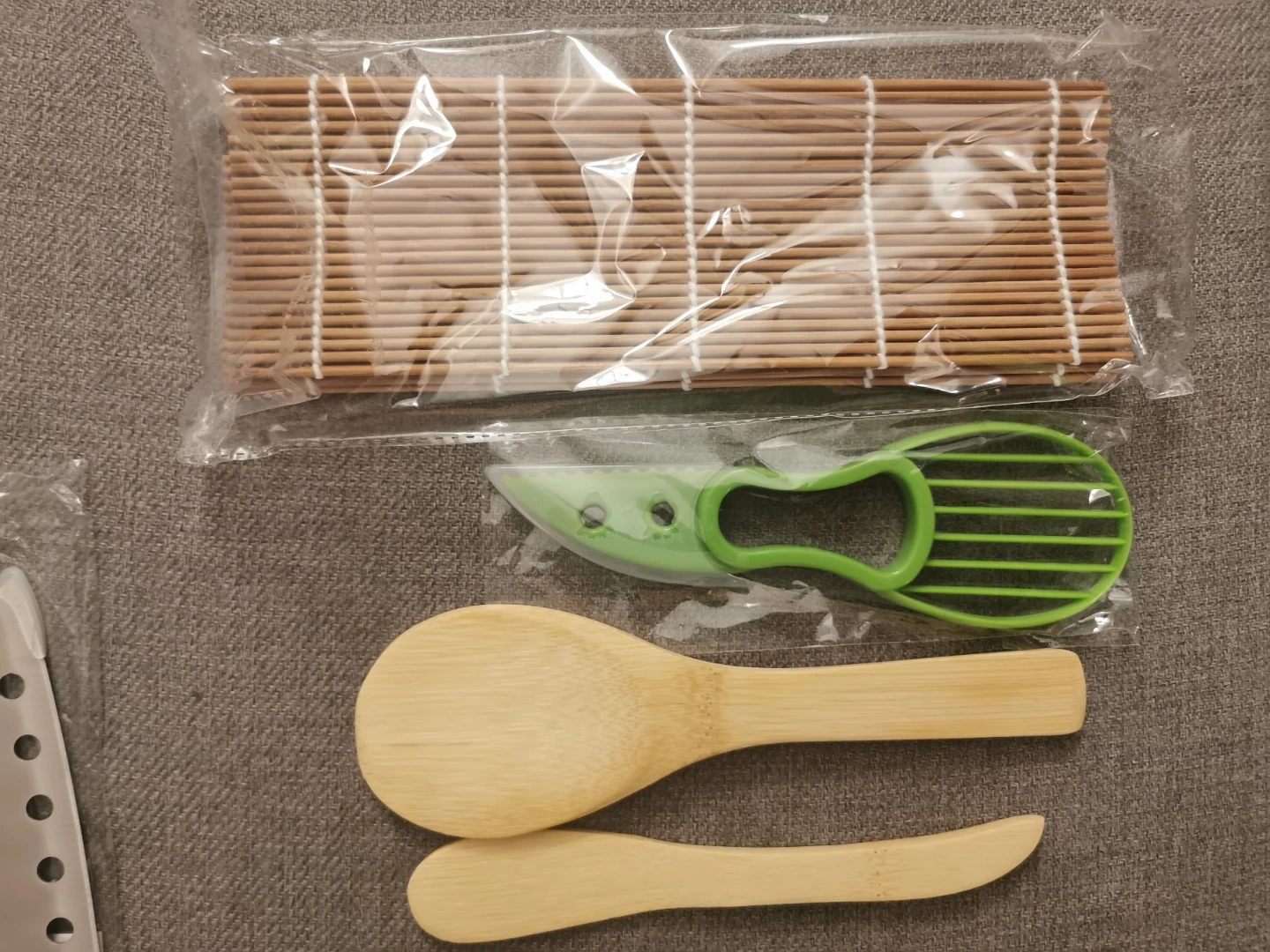 This is a sushi making kit, perfect for home chefs. It includes a rolling mat, rice paddle, spoons, sauce dishes, chopstick rests, and chopsticks. You also get a sushi rice mold and a knife to get you started.