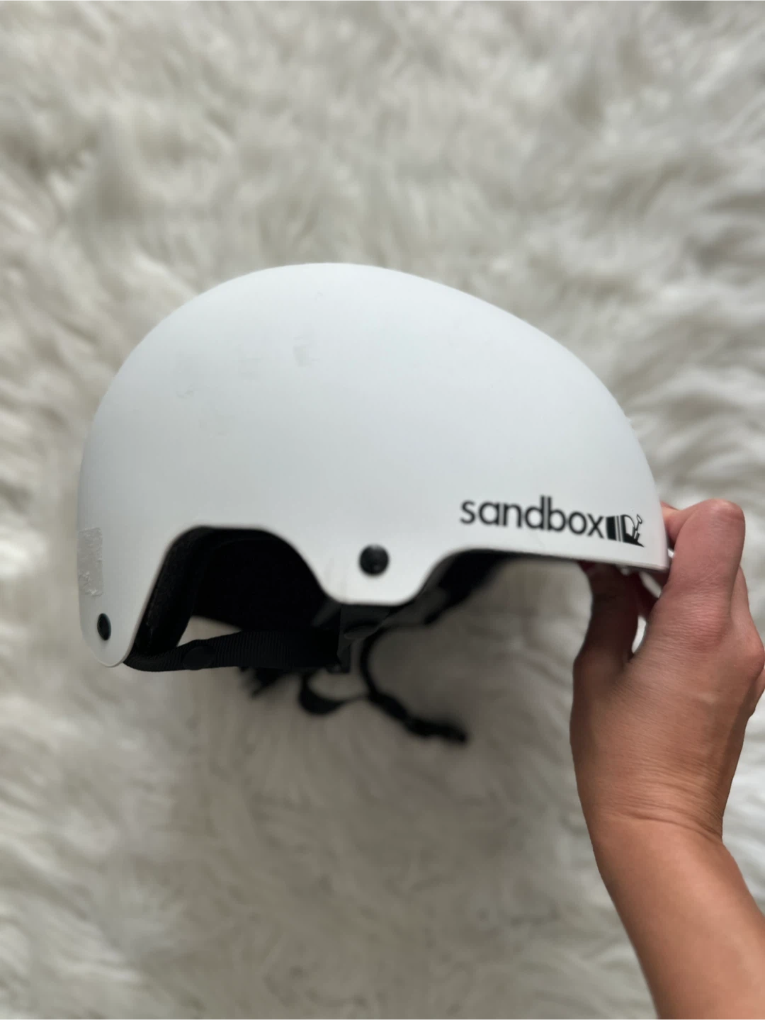 Selling a Sandbox Icon helmet in white, size small. It's in great condition and ready for the slopes or park! The helmet is designed for alpine use and provides excellent protection.