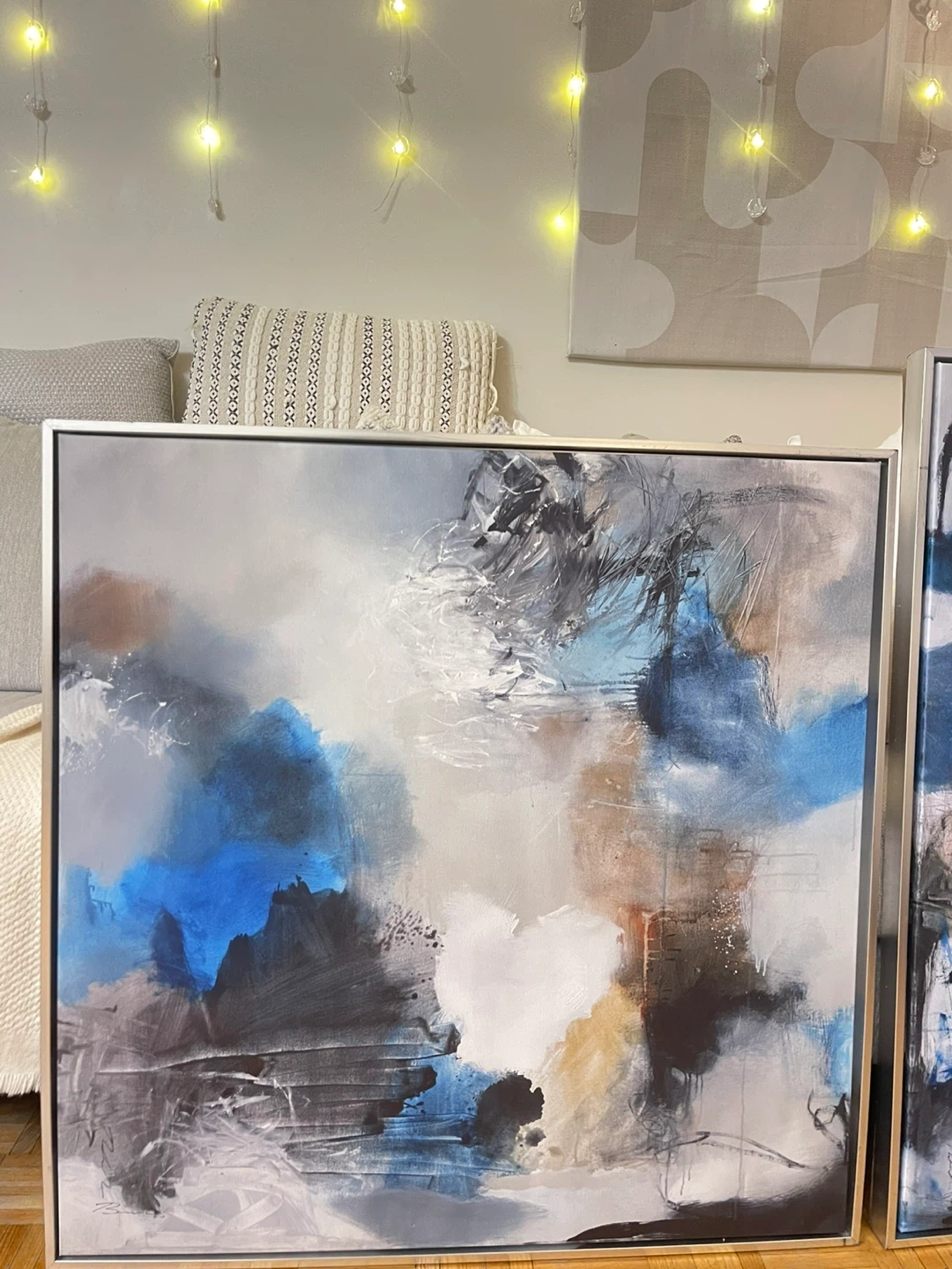 Set of three abstract canvas paintings. Features modern designs with bold colors and metallic accents. Framed and ready to hang! One of them it’s huge silver frame one of them it’s very huge