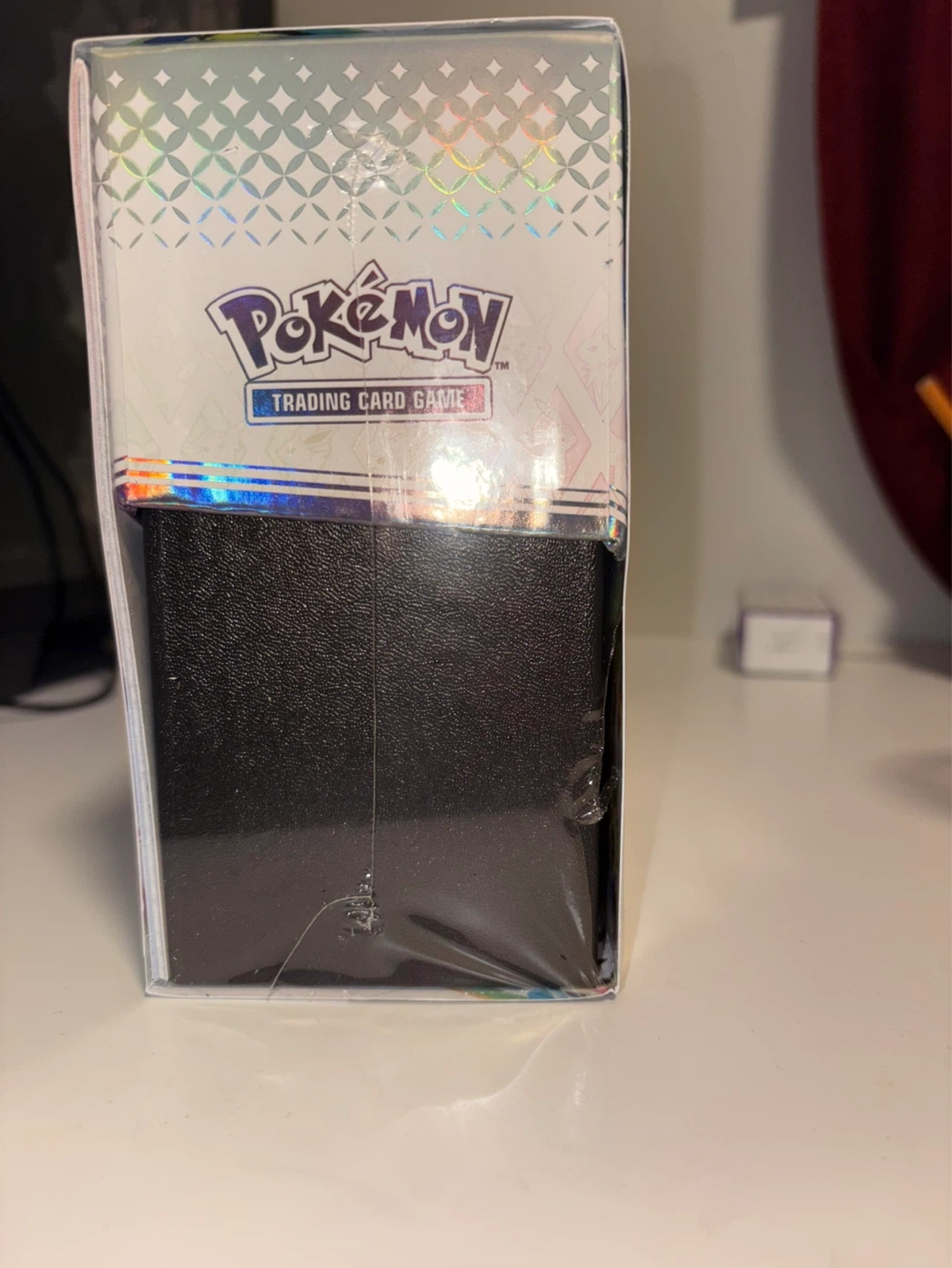 This is a brand new, sealed Pokemon with tear on the side. Scarlet & Violet—Prismatic Evolutions Elite Trainer Box. It includes 9 booster packs, 65 card sleeves featuring Eevee, and other accessories for the TCG.