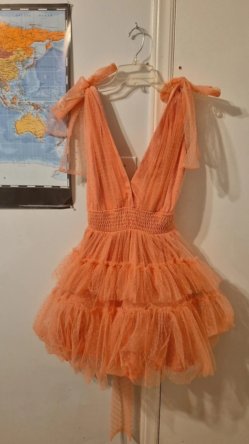 Selling a cute Princess Polly mini dress in a peach colour! It's a size 8 and features a V-neck and tiered ruffles. Perfect for a party or special occasion!