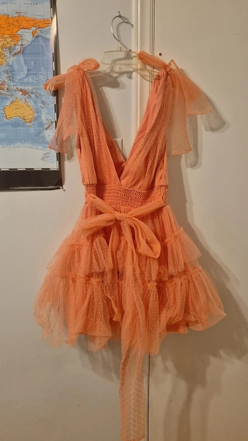 Selling a cute Princess Polly mini dress in a peach colour! It's a size 8 and features a V-neck and tiered ruffles. Perfect for a party or special occasion!