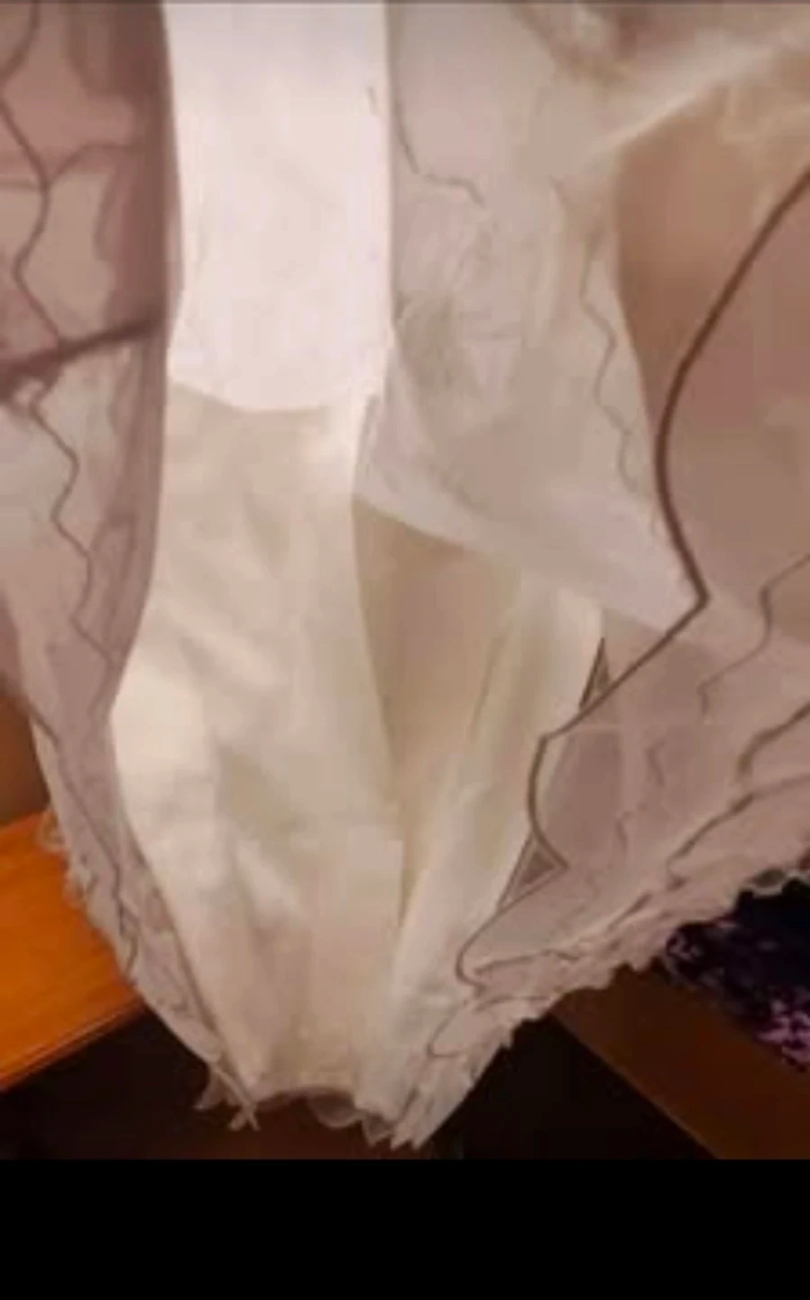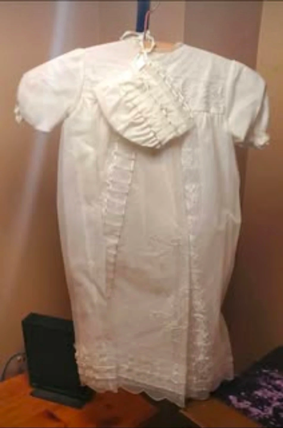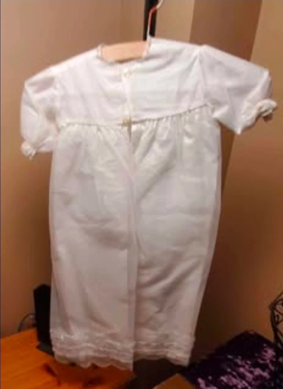 This is a sweet white christening gown and bonnet set for a baby. The gown features intricate embroidery and delicate lace trim. It comes with a matching bonnet, also trimmed with ruffles and lace.