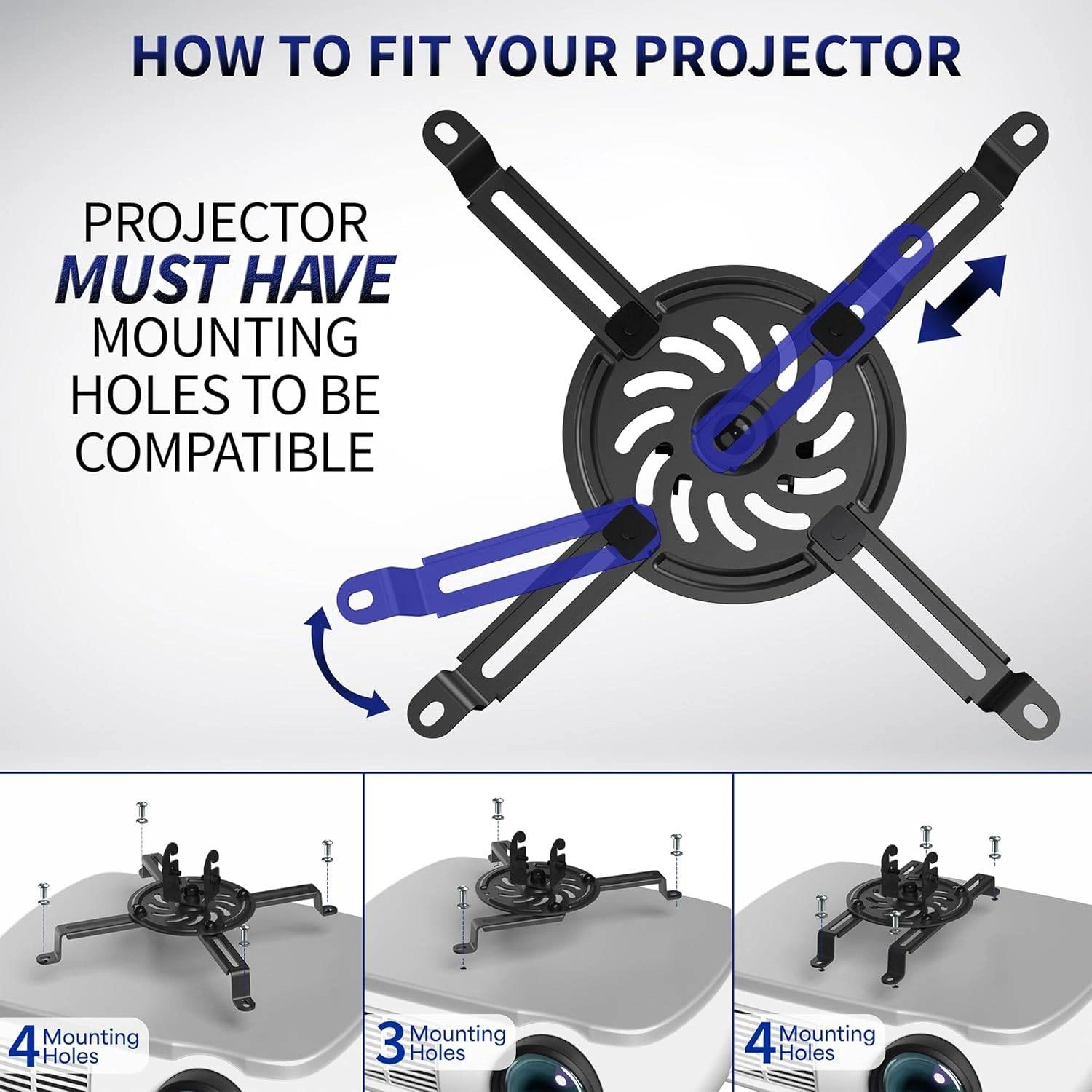 Selling a projector ceiling mount! It's black and designed to hold up to 30 lbs. The mount extends 6 inches from the ceiling and is adjustable from 2 to 12.5 inches. It's compatible with projectors that have mounting holes.