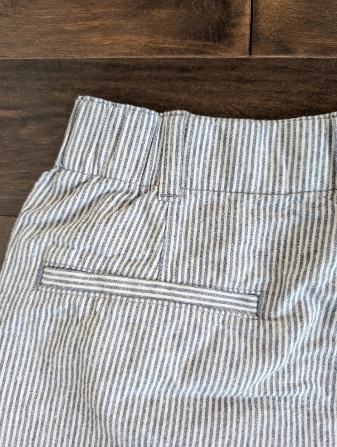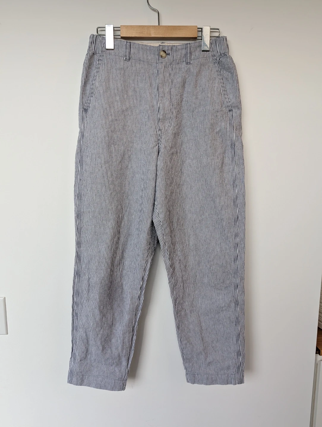 Blue and white striped Uniqlo trouser pants.