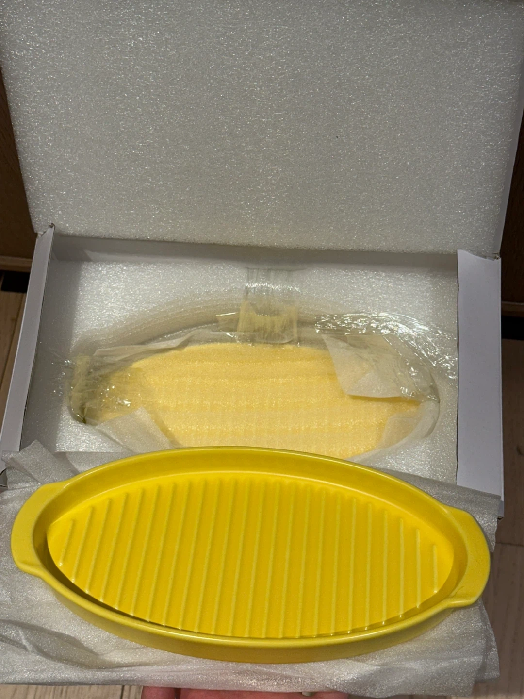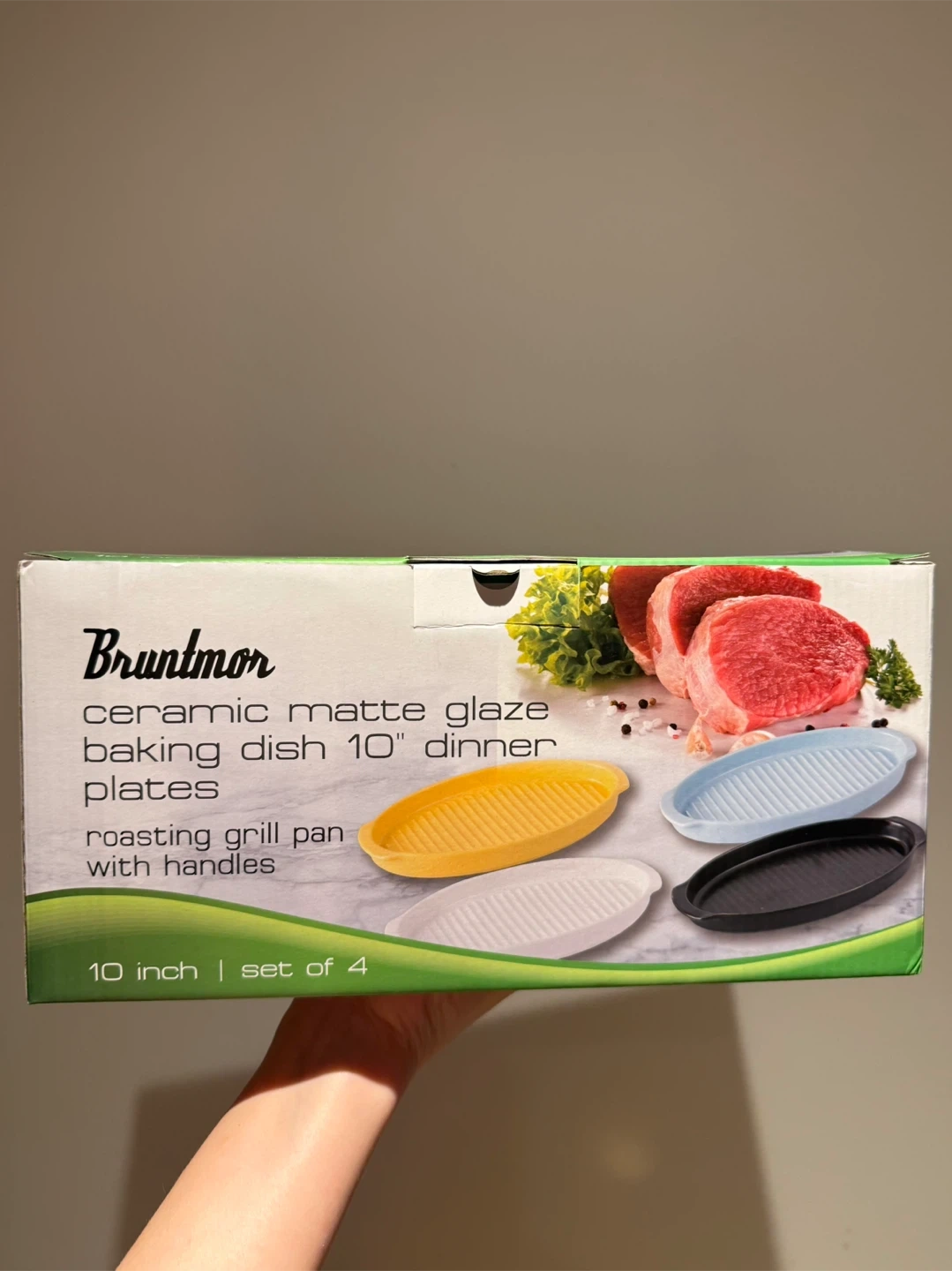 Bruntmor ceramic matte glaze baking dish. This is a 10-inch dinner plate designed as a roasting grill pan with handles. It's microwave, oven and dishwasher safe. 4 in yellow.