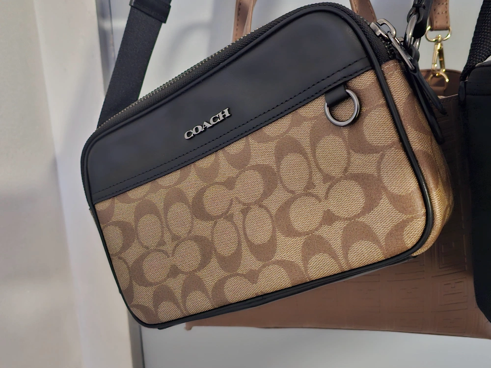 Small crossbody bag with a signature Coach pattern, black leather accents, and an adjustable strap.