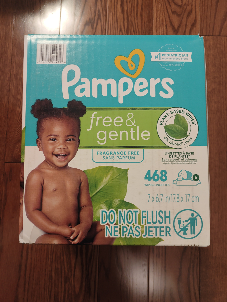 Selling a box of Pampers Free & Gentle wipes! It has 468 wipes in the box. These wipes are fragrance-free and made with plant-based materials, so they're gentle on your little one's skin. Plus, they're free of alcohol and dyes. The box measures 7 x 6.7 in/17.8 x 17 cm