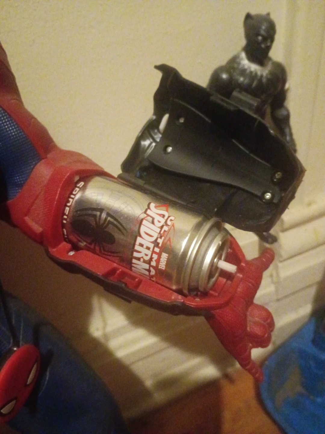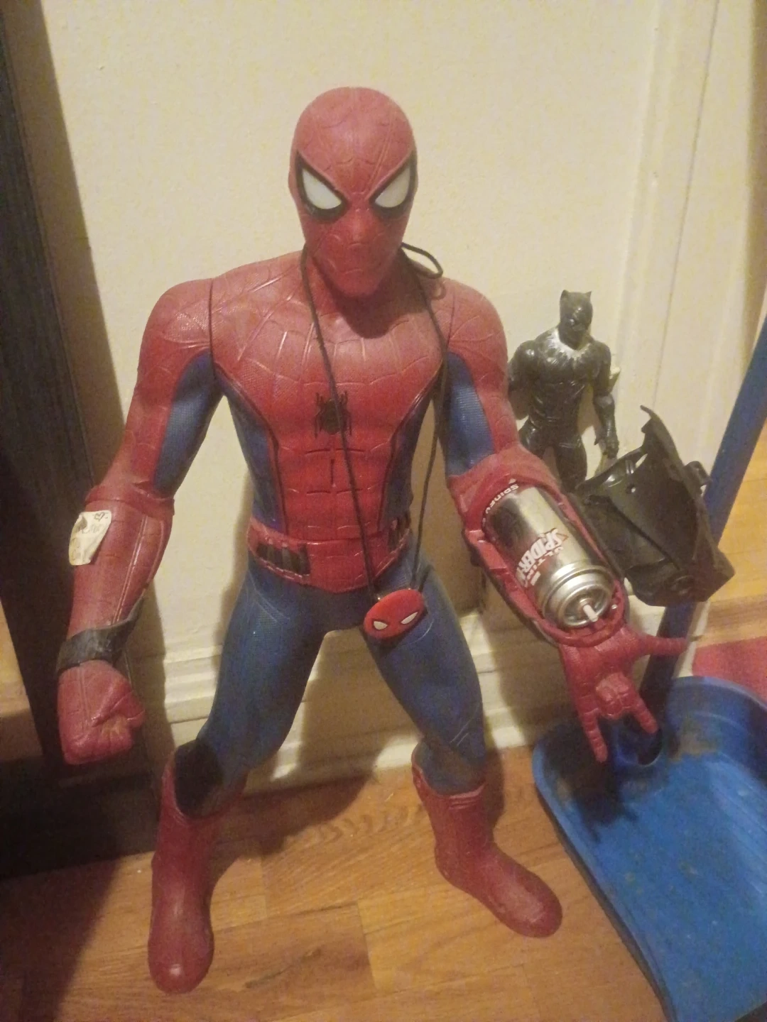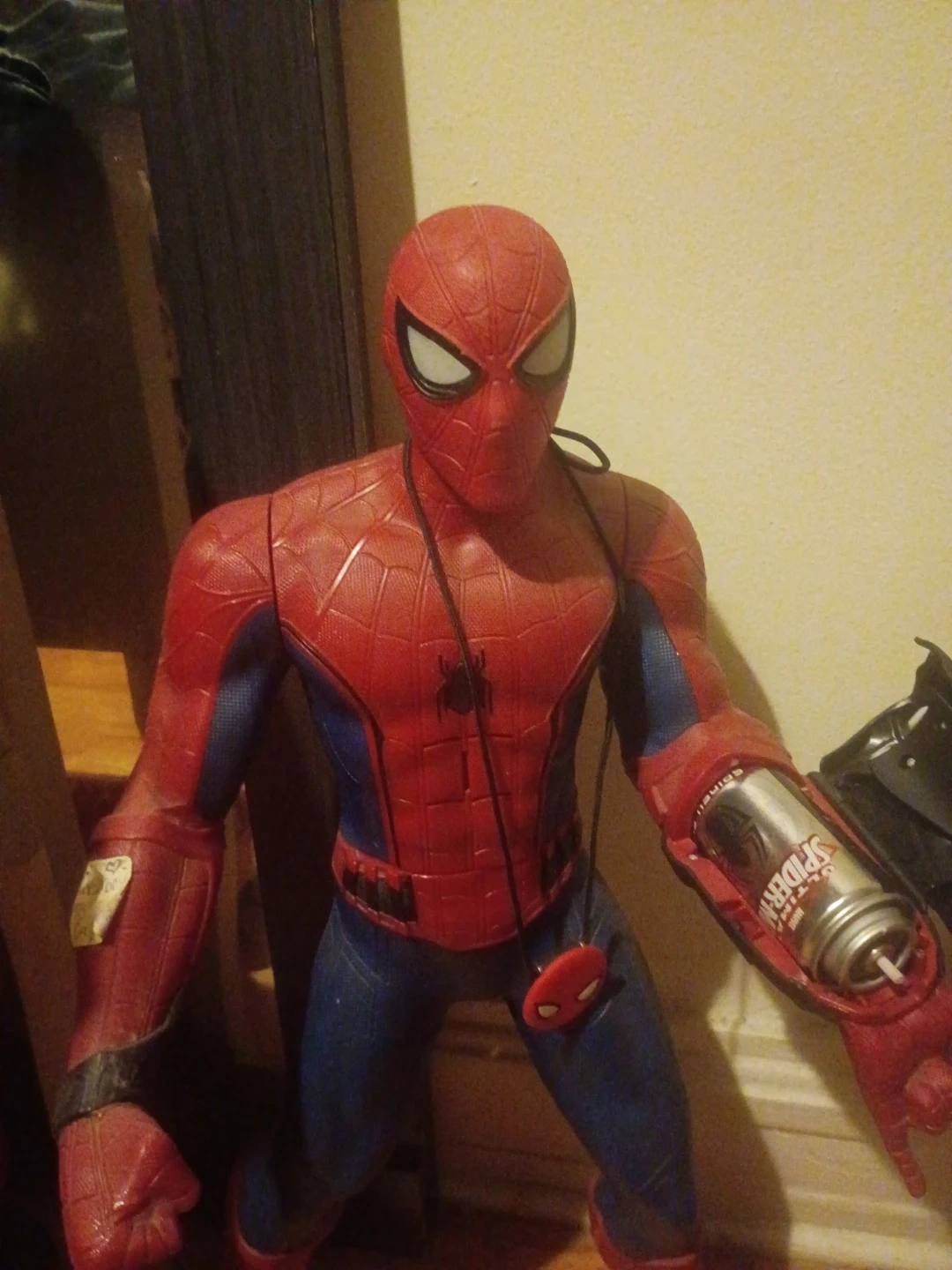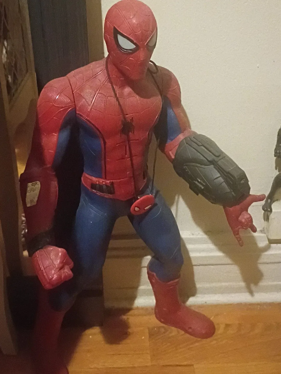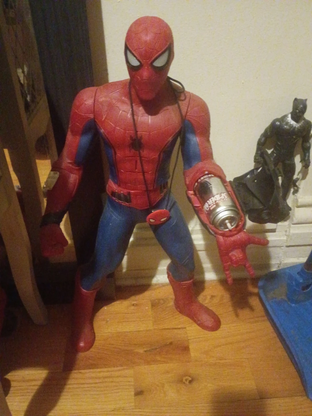 This is a Spiderman action figure. It comes with a web-shooter accessory on its arm. The figure is red and blue with black and grey accents. It's perfect for any Spiderman fan!