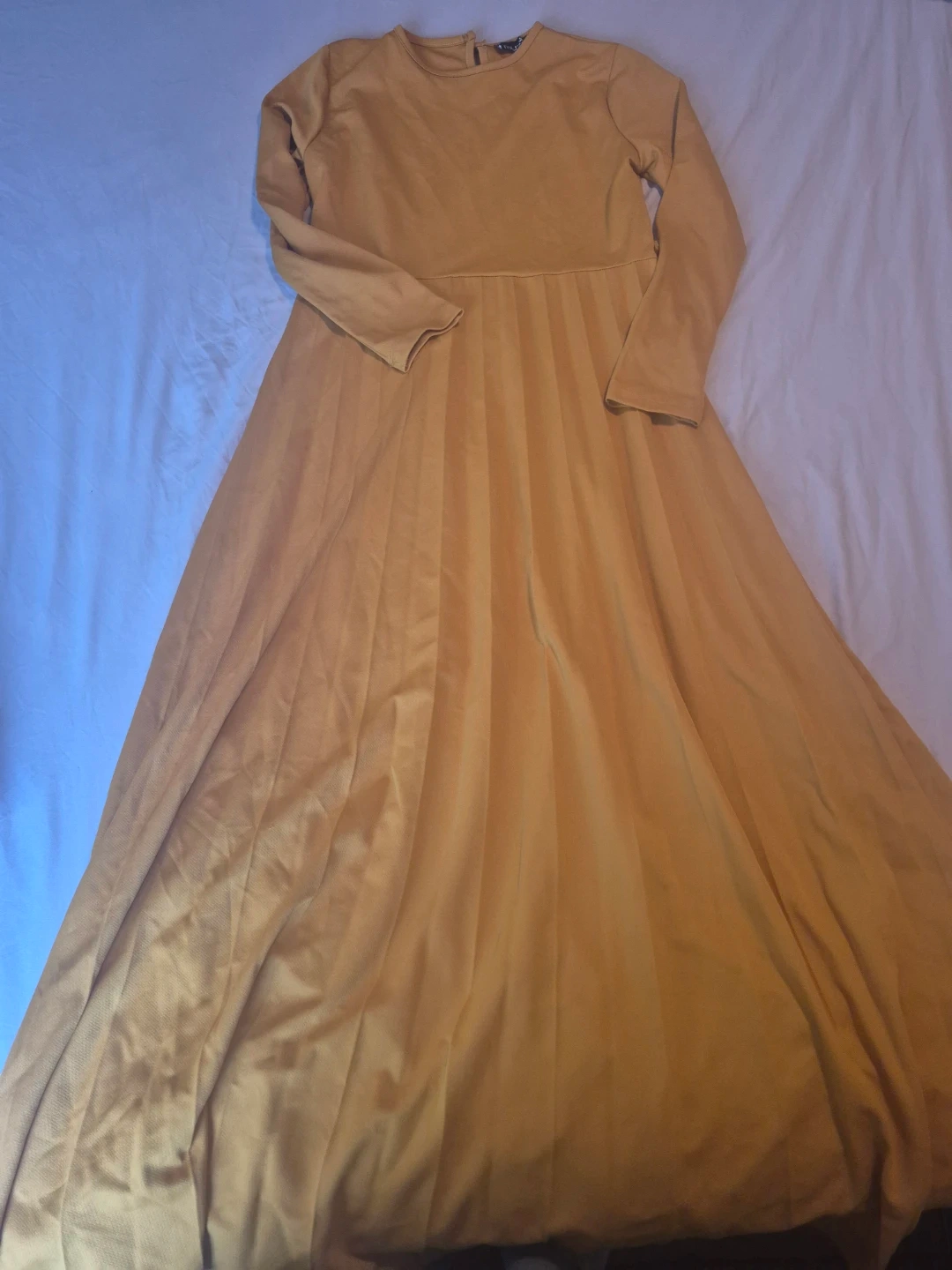 A mustard yellow maxi dress with long sleeves and a pleated skirt. It's made from a comfortable, flowing fabric. This dress is suitable for various occasions.