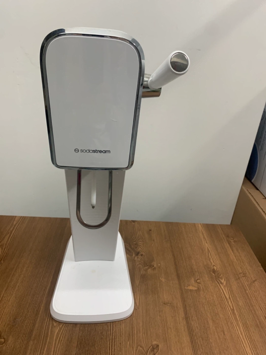 This is a SodaStream sparkling water maker. It's white with chrome accents and a white lever. It's a great way to make fizzy drinks at home!