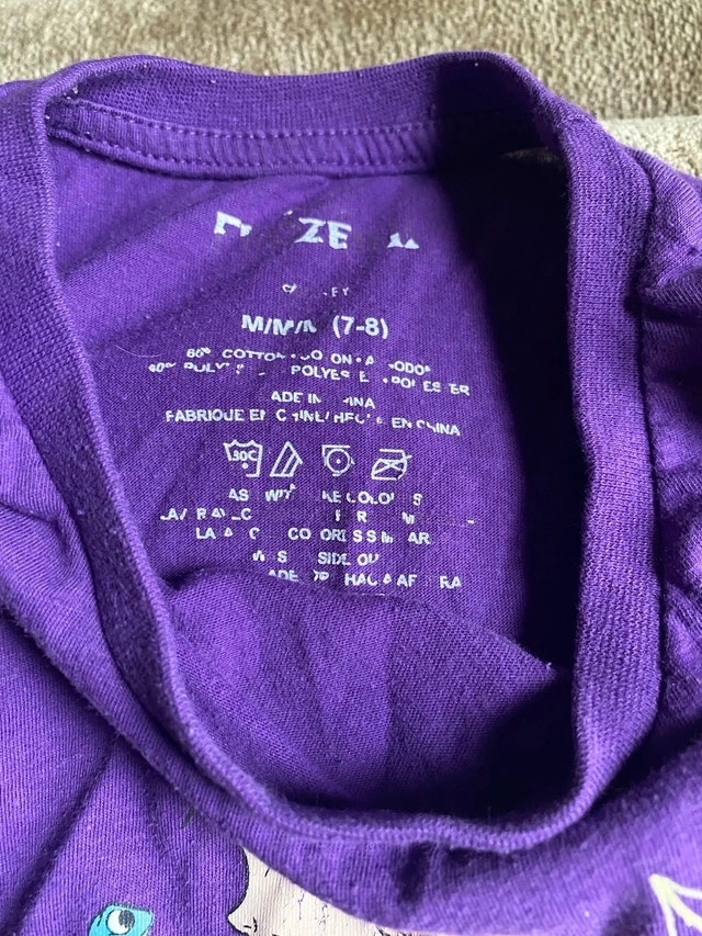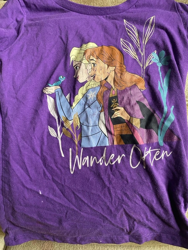 Used Disney Frozen purple shirt, size M (7-8). Features Anna and Elsa with the phrase 'Wander Often'. Please note the stains on the front as shown in the images. If the ad is still up, it's still available! Cash accepted. As is, no refunds. Price is firm.
