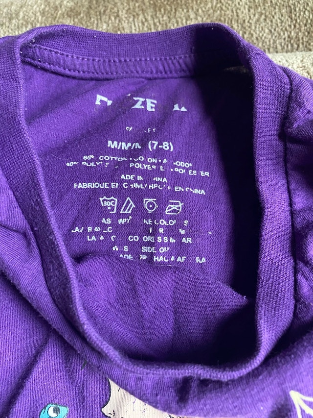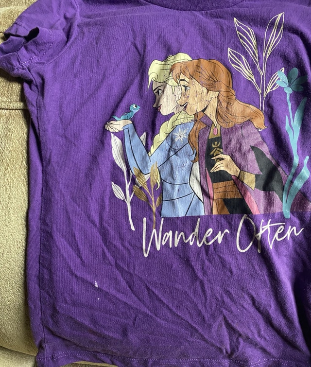 Used Disney Frozen purple shirt, size M (7-8). Features Anna and Elsa with the phrase 'Wander Often'. Please note the stains on the front as shown in the images. If the ad is still up, it's still available! Cash accepted. As is, no refunds. Price is firm.