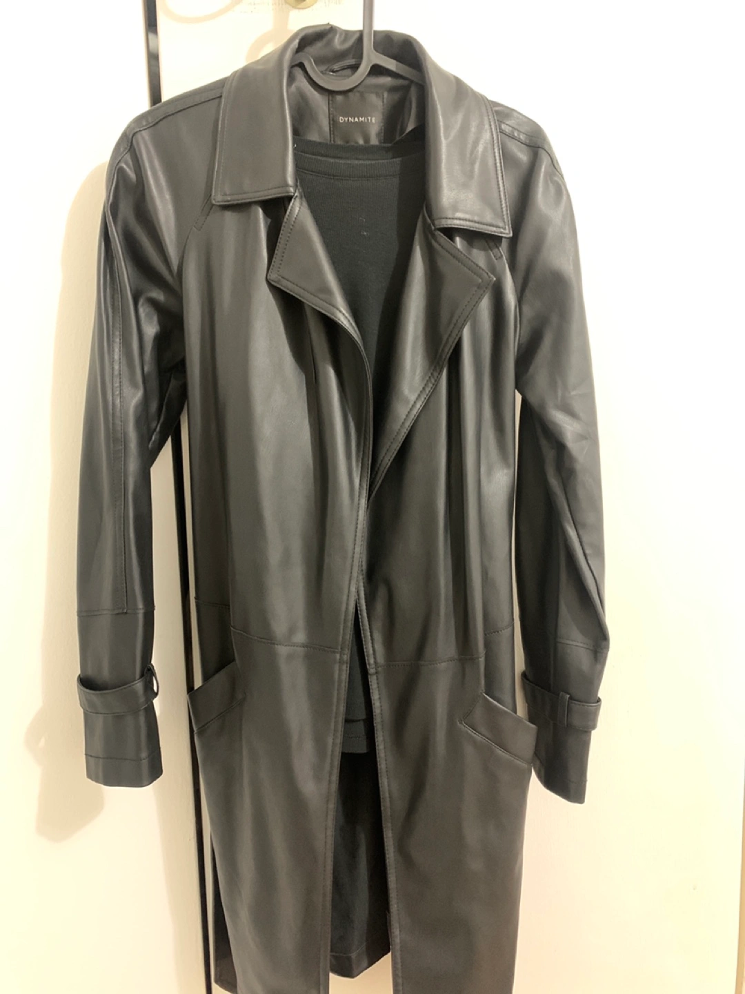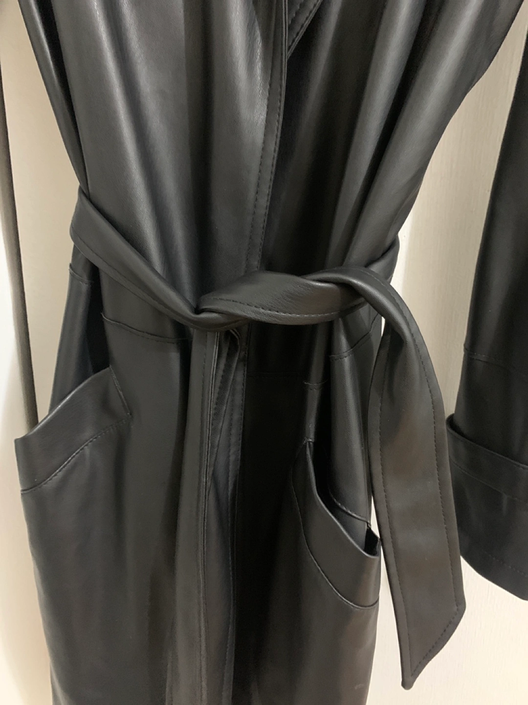 Long black faux leather trench coat. a belted waist, long sleeves, and pockets. Size Small.