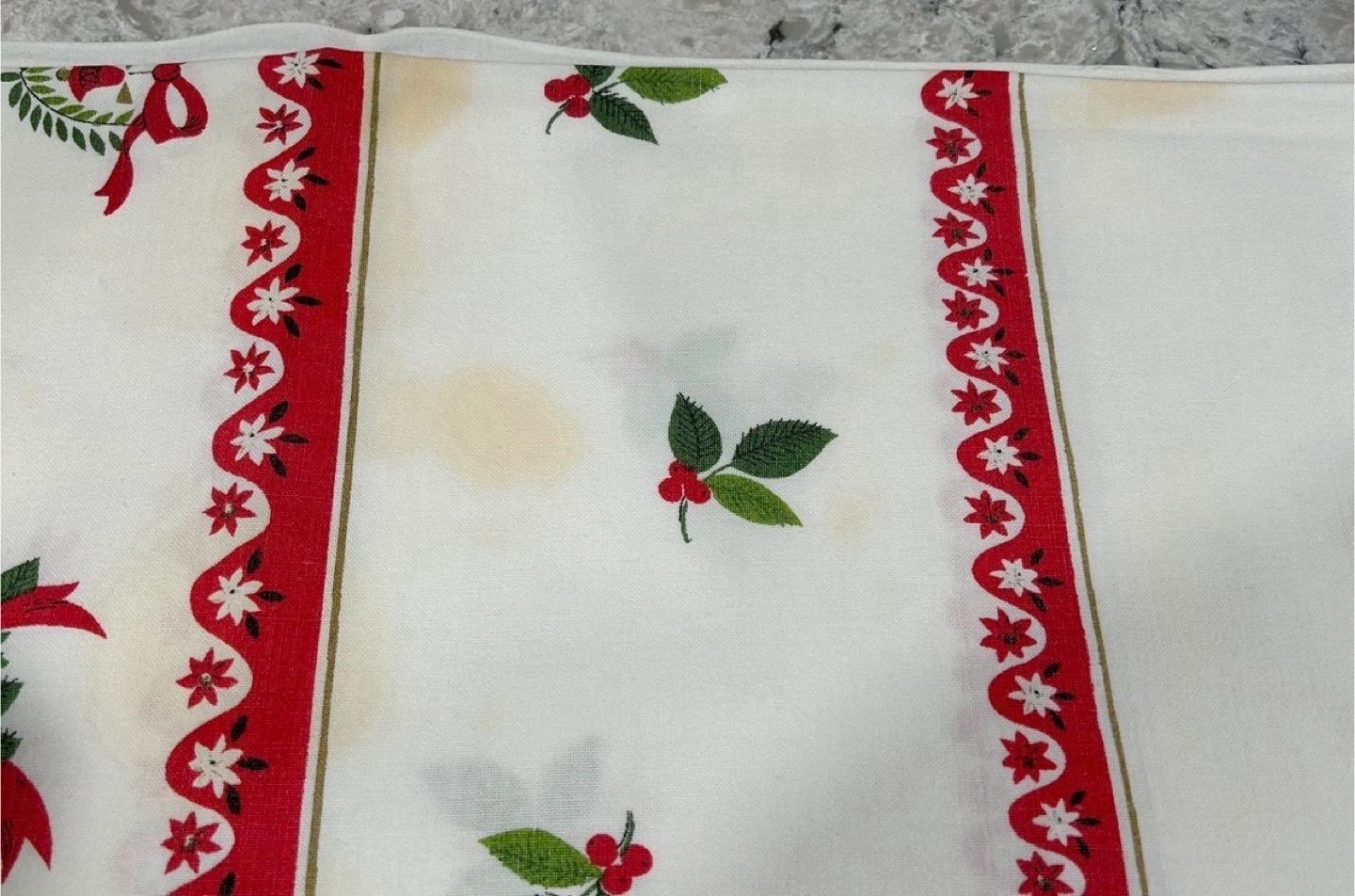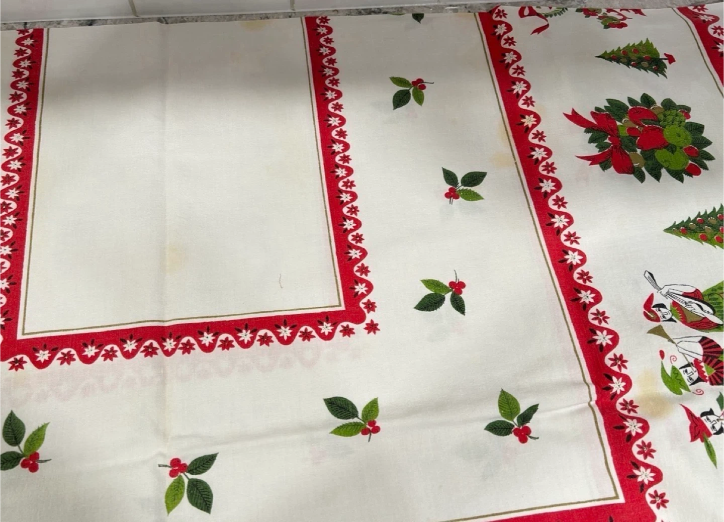 Features a red and white border with holly leaves and berries scattered throughout. There are also images of Christmas trees, wreaths, and figures in green and red outfits.
