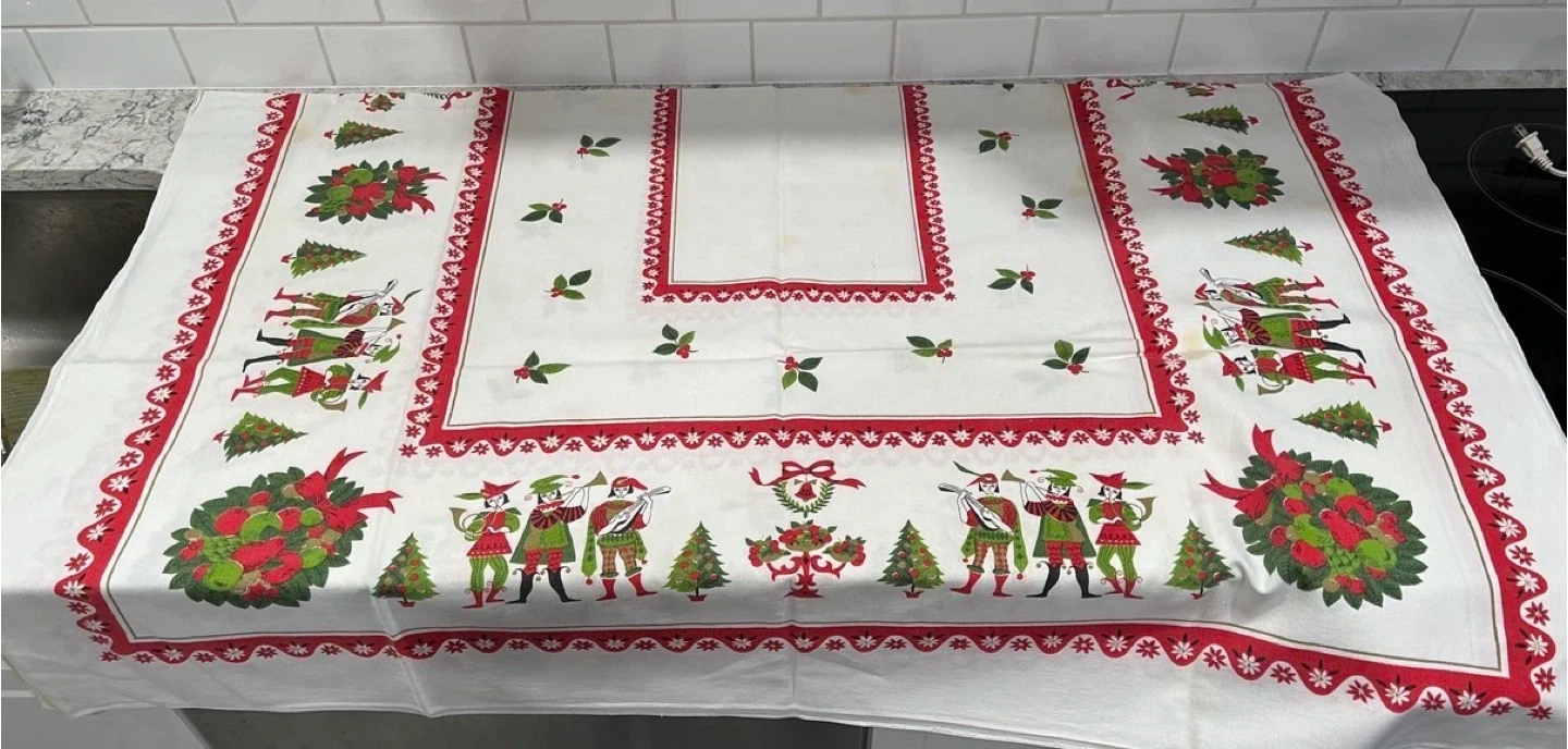 Features a red and white border with holly leaves and berries scattered throughout. There are also images of Christmas trees, wreaths, and figures in green and red outfits.
