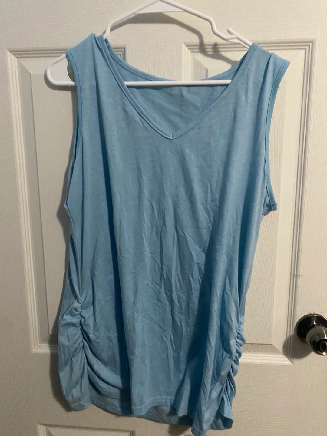 A light blue, sleeveless tank top with a V-neckline. It features ruching on the sides. The material is soft and stretchy.