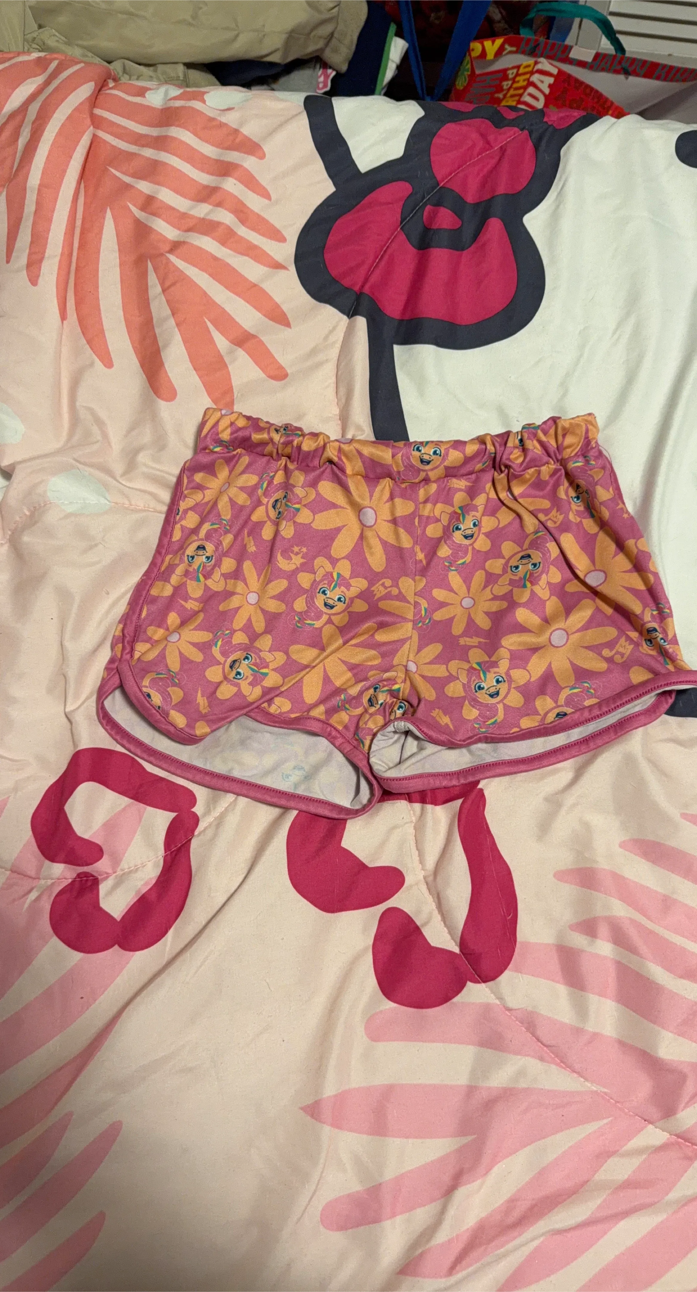 These cute pink pyjama shorts feature a fun floral and character print. They have an elastic waistband for a comfortable fit. Perfect for lounging or sleeping!