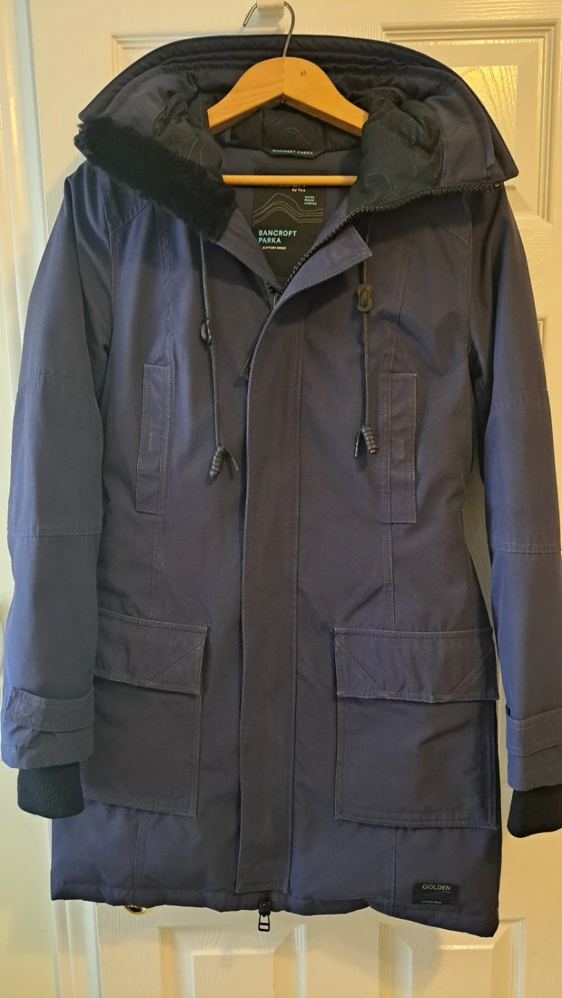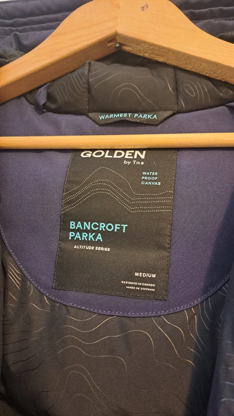 A women's Tna Bancroft Parka in size medium. It's the warmest parka style with waterproof canvas. It's filled with premium goose down and RDS certified. Designed in Canada, made in Vietnam.