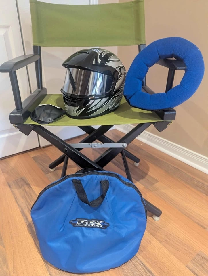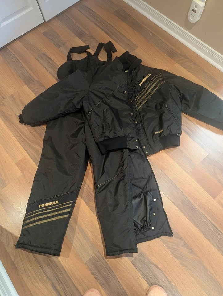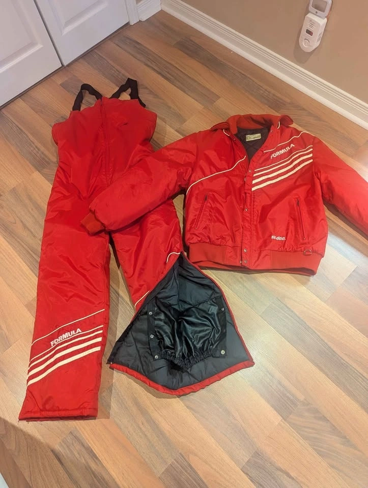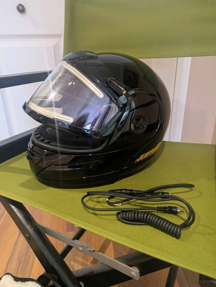 Includes 2 adult XXL helmets with heated visors (unheated visors also included) and 2 youth helmets (SM/MED) with neck collars. Also includes gloves and 2 adult snowmobile suits (size 46-48 regular, full bib pants). Helmets are clean and stored in fleece bags. Suits have all working snaps and zips. Both suits were professionally cleaned.