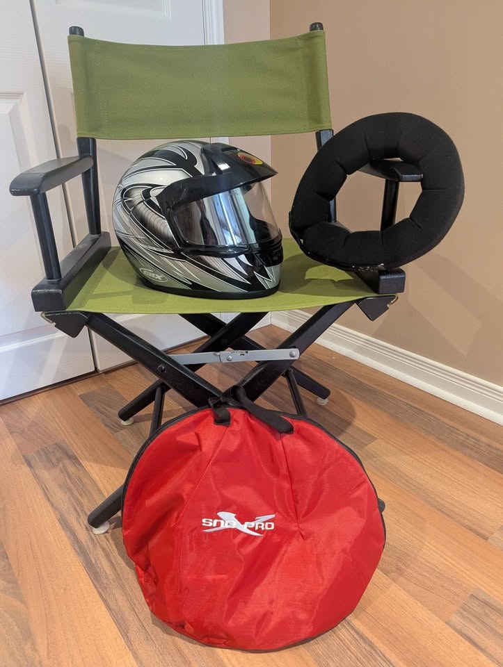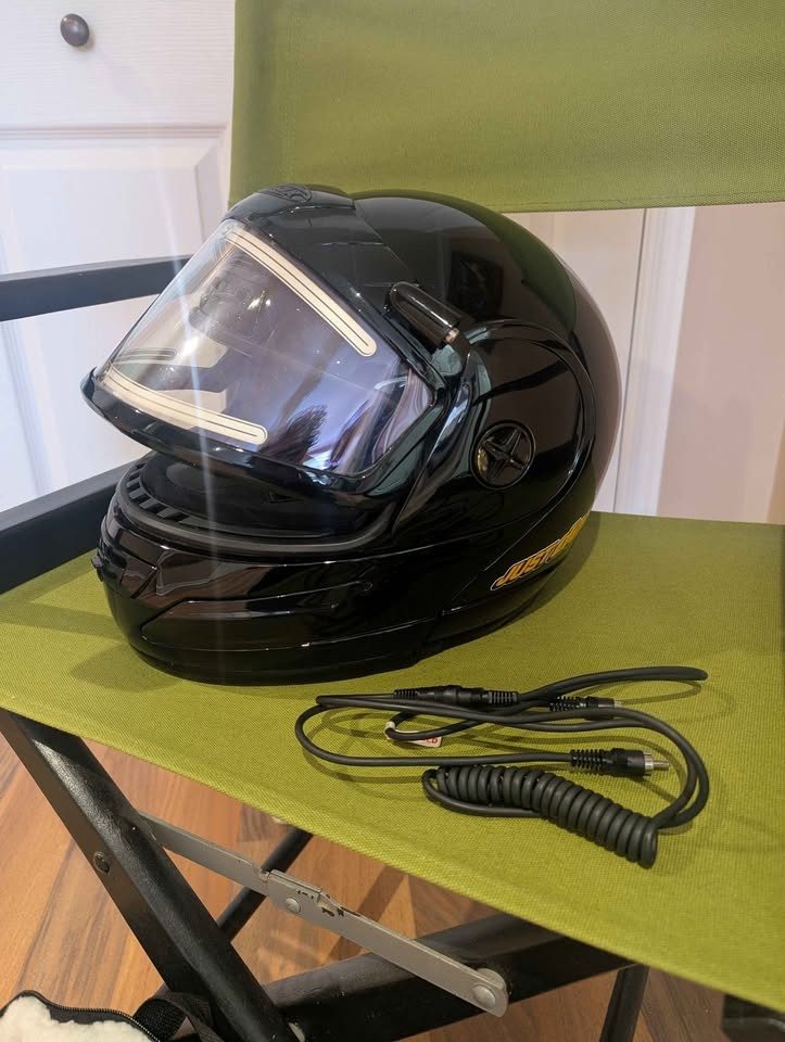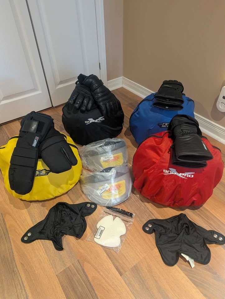 Includes 2 adult XXL helmets with heated visors (unheated visors also included) and 2 youth helmets (SM/MED) with neck collars. Also includes gloves and 2 adult snowmobile suits (size 46-48 regular, full bib pants). Helmets are clean and stored in fleece bags. Suits have all working snaps and zips. Both suits were professionally cleaned.